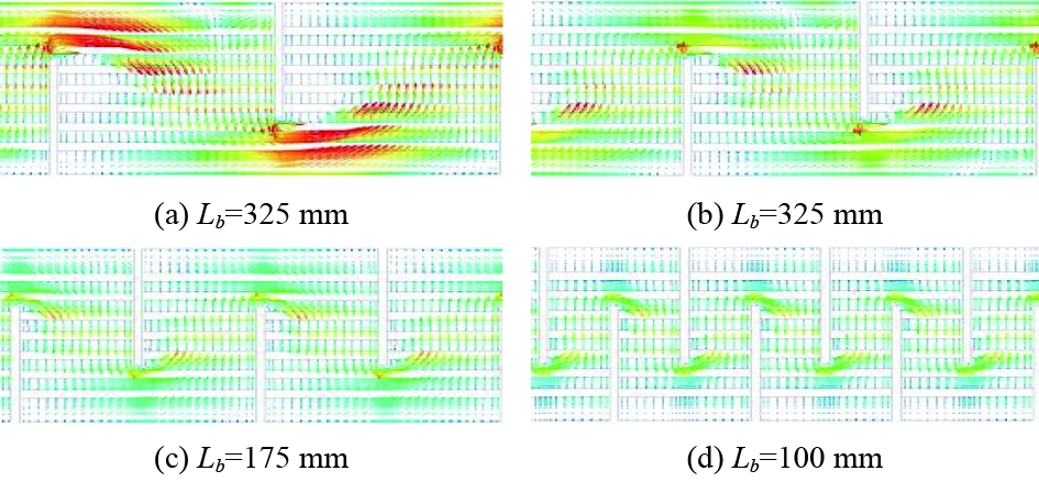 图10为在雷诺数Re=6.4×104值相同的情况下管道间空间纵向截面中的流速矢量,穿过折流板的主交叉流在截面上分布不均匀,并流到下一折流板附近。在这种情况下,折流板后面形成了冷却剂运动速度低的停滞区。在折流板缺口区域,冷却剂分布也不均匀:在长距离(325 mm、250 mm)下,冷却剂几乎占据了所有缺口截面,在短距离(100 mm)下,冷却剂不超过通过截面的一半,即在折流板间距短时,冷却剂在外壳附近也形成了阻塞区。如果折流板缺口区域和折流板之间的通流量截面面积明显不同(Lb<150 mm,Lb>300 mm),则在折流板缺口区域中会发生显著的加速或减速。因此,在2个横折流板之间的空间中,可以区分主流区、停滞区和绕行区。