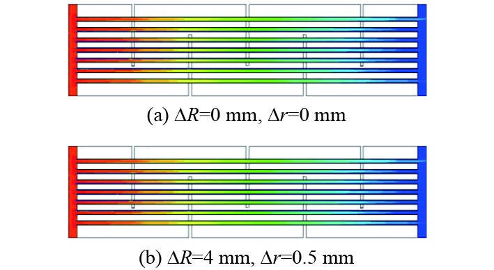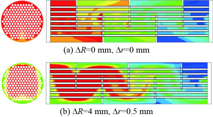 图 8 壳程进出口温度差和散热系数与间隙ΔR和Δr的关系图 Fig. 8 Relationship between the temperature difference and heat dissipation coefficient of the inlet and outlet of the shell side and the gap ΔR and Δr |