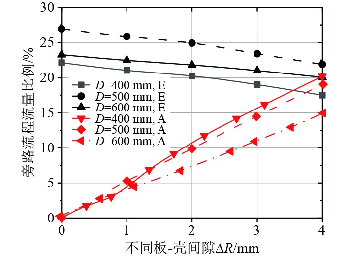 图 5 Δr=0.5 mm时,不同板-壳间隙ΔR下流程A和流程E的实际流量比例 Fig. 5 Δr=0.5 mm, the actual flow ratio of process A and process E under different plate shell clearances ΔR |