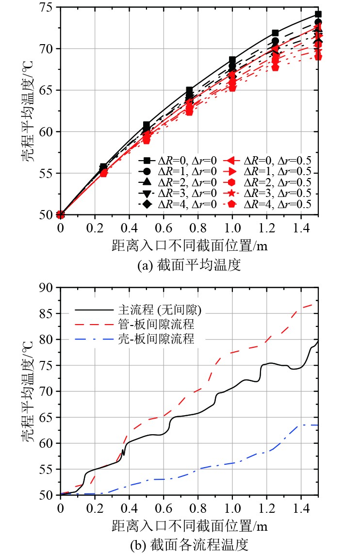 直径400 mm管壳换热器不同板-壳间隙ΔR和板-管间隙Δr下壳程不同截面处温度如图7所示。图7(a)表征了主流程和旁路流程对温度变化的共同影响。图7(b)反映了板-壳间隙和板-管间隙相对主流程的温度变化,相对与无间隙管间空间中的主流程相比,通过换热器分段挡板处间隙流程比主流程温度更高。流程A的温度要低得多,因为它绕过热交换表面,与主流程的相互作用较弱,仅在与管道间空间出口处的主流程混合,导致温度偏离预期值;另外,间隙大小与剖面温度的偏差均匀且与成比例。