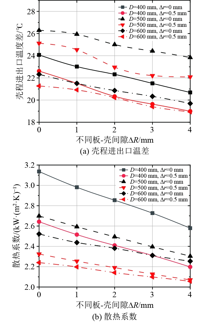壳程进出口液体温度差与间隙ΔR和Δr之间的关系如图8(a)所示,板-壳间隙ΔR和板-管间隙Δr与壳程进出口液体温度差成反比,即随着间隙变大,壳程进出口液体温度差变小,壳程冷却剂效率降低。图8(b)为管道间空间散热系数与间隙大小的关系图。间隙的大小对传热强度有很大影响。在允许的间隙范围内,旁路流程降低了传热强度。对于直径为400、500、600 mm、具有最大径向间隙的管壳换热器,散热系数分别降低34%、26%和19%,同时,总传热系数降低了16%、13%和10%。