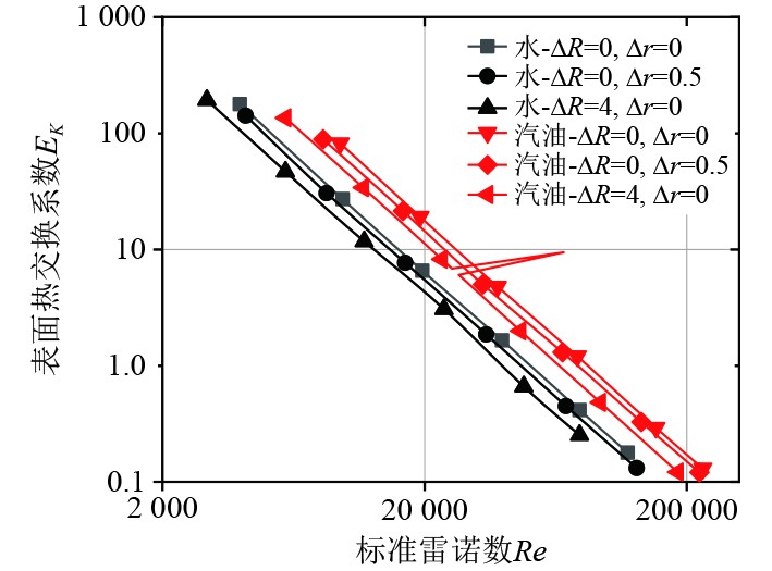 图 9 不同间隙表面热交换效率EK与标准雷诺数Re的关系 Fig. 9 Relationship between surface heat exchange efficiency EK and standard reynolds number Re at different gaps |