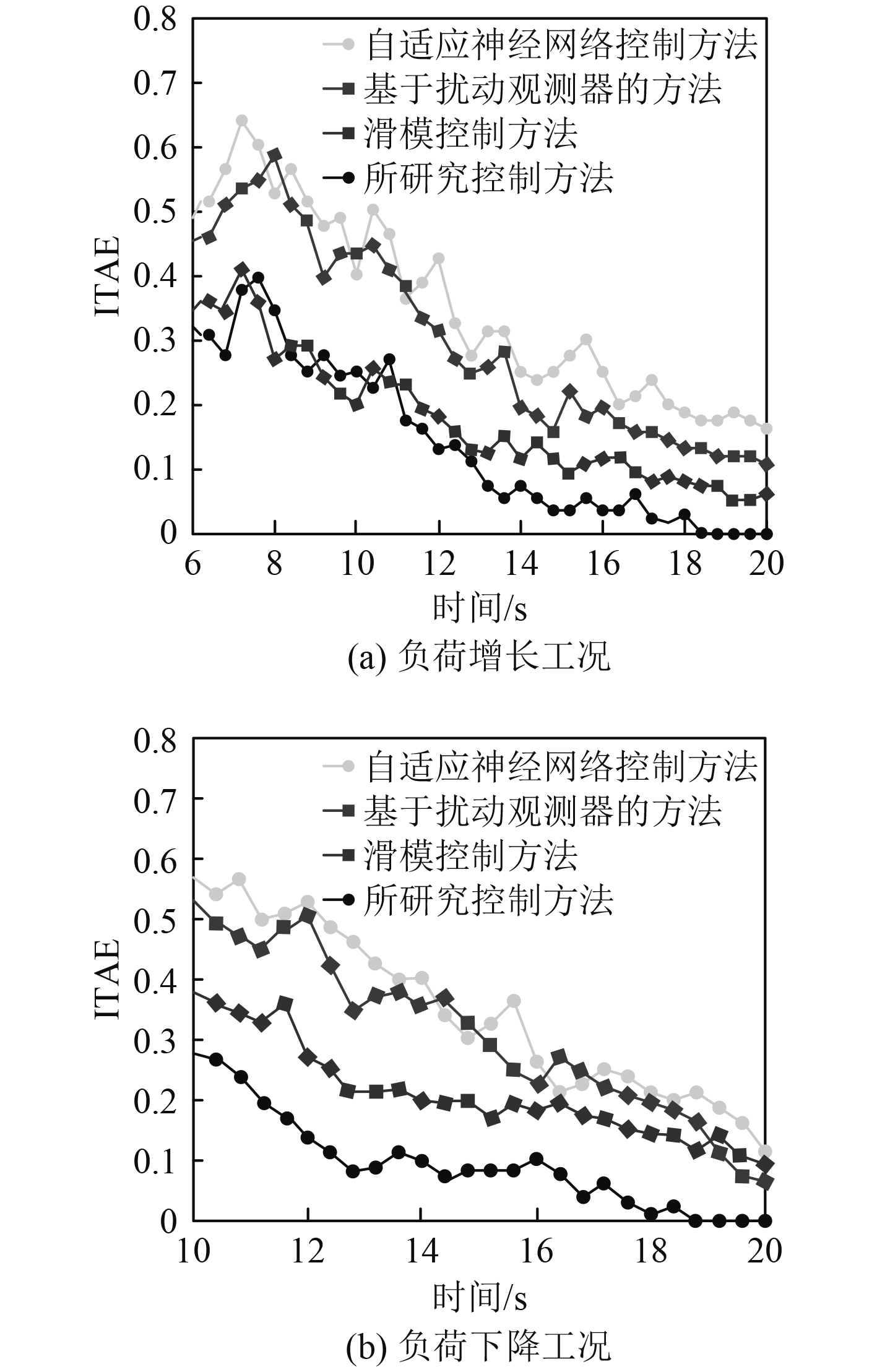 可知,所研究方法应用下,ITAE值均要相对更低,说明该方法能够更为精准地维持稳定性,反映了该方法在负荷状态变化条件下具有优越的控制性能,能够有效减少波动,保持输出与期望值的紧密一致性;而其他方法在面对负荷增长工况时,ITAE相对较高,滑模控制的ITAE的相对较低,尤其是在前期,控制效果相对显著;另一方面,当面对负荷下降工况时,3种控制方法的表现均相对较差,ITAE值普遍较高。