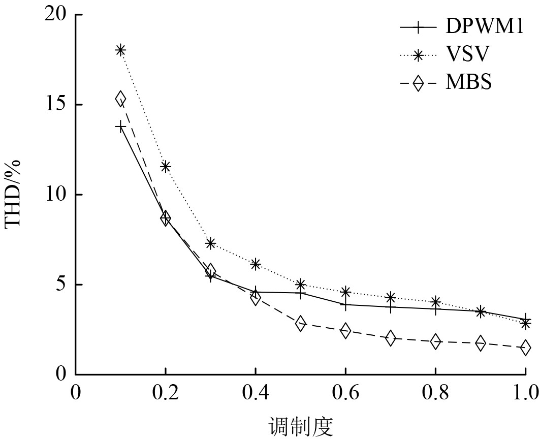 输出电压的谐波特性可用THD来评价,如图10所示,对3种调制方法在不同