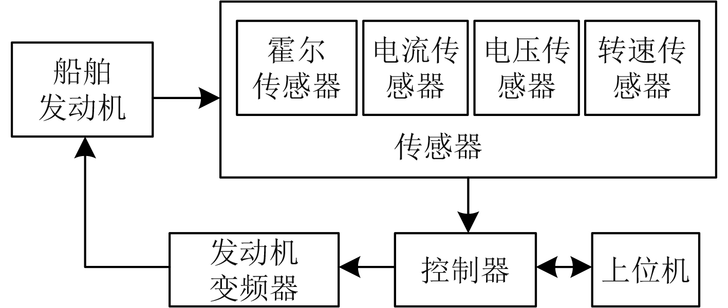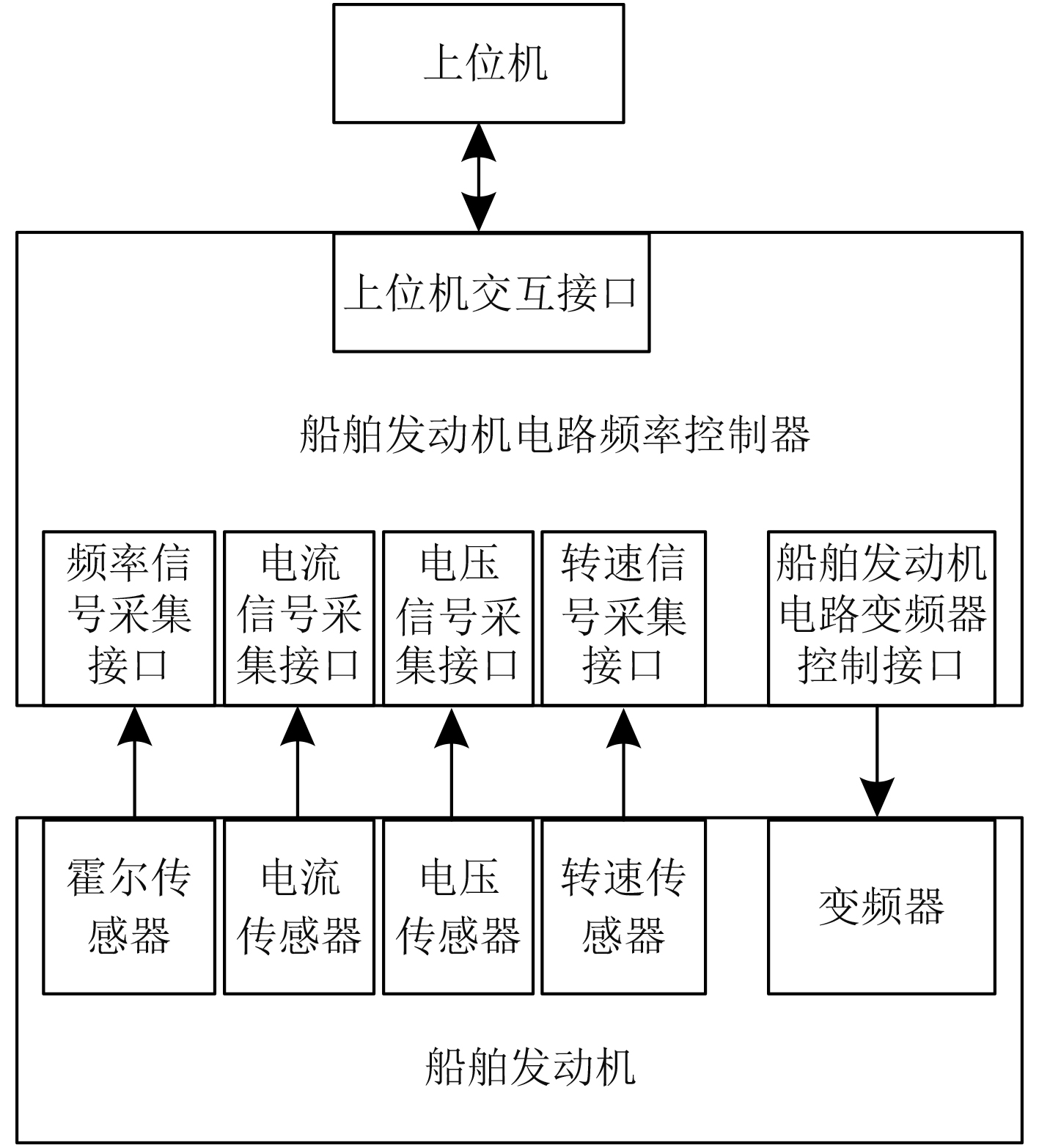 其中,频率、电流、电压、转速采集接口分别同船舶发动机电路上的霍尔传感器、电压传感器、电流传感器及转速传感器相连接,用于实时获取此类传感器采集的发动机电路的频率、电流、电压、转速信号;发动机电路变频器控制接口同发动机电路中的变频器相连接,用于通过控制器所输出的调节信号实施相应控制;上位机交互接口同上位机之间经由串口相连接,用于实时交互各类发动机电路数据。