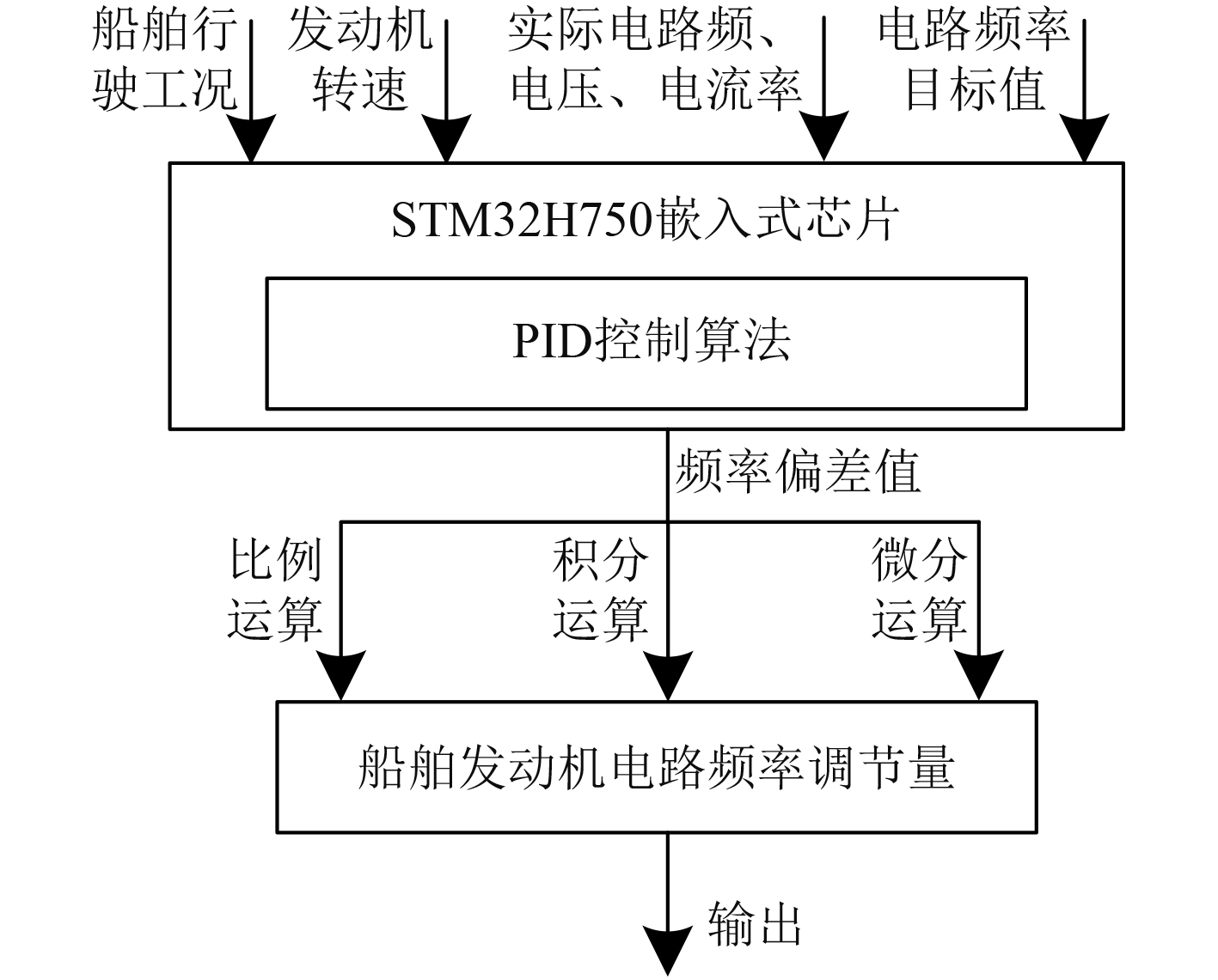 以船舶不同行驶工况下的发动机电路频率目标值,以及实际转速、电路频率、电压、电流等数据为输入,利用STM32H750芯片内PID控制算法,根据各工况电路频率偏差值进行比例、积分、微分运算,得出不同工况下船舶发动机电路频率的调节量输出:
