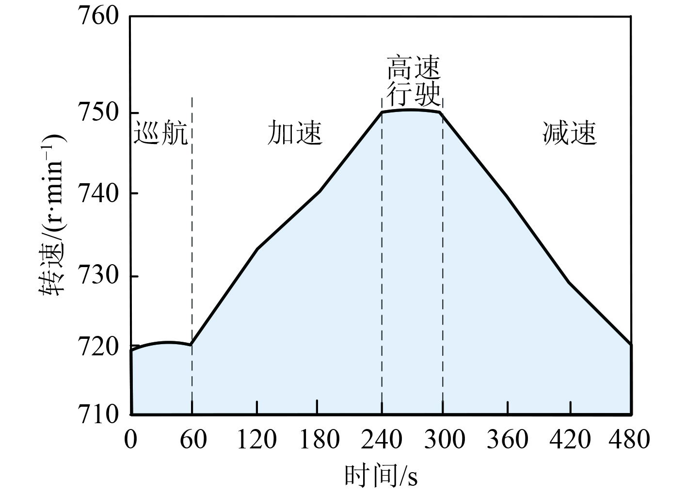可以看出,实验船舶发动机在0~60 s内处于巡航工况下,此时其转速在720 r/min附近;在60~240 s内处于加速工况下,期间其转速逐渐由720 r/min升高到750 r/min;在240~300 s内处于高速行驶工况下,此时其转速在750 r/min附近;在300~480 s内处于减速工况下,期间其转速逐渐由750 r/min降低至720 r/min。