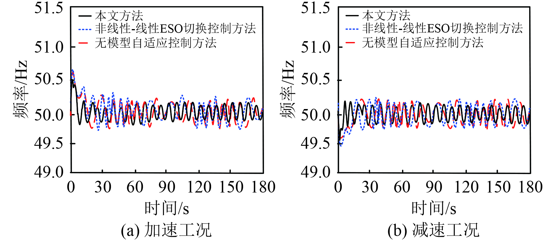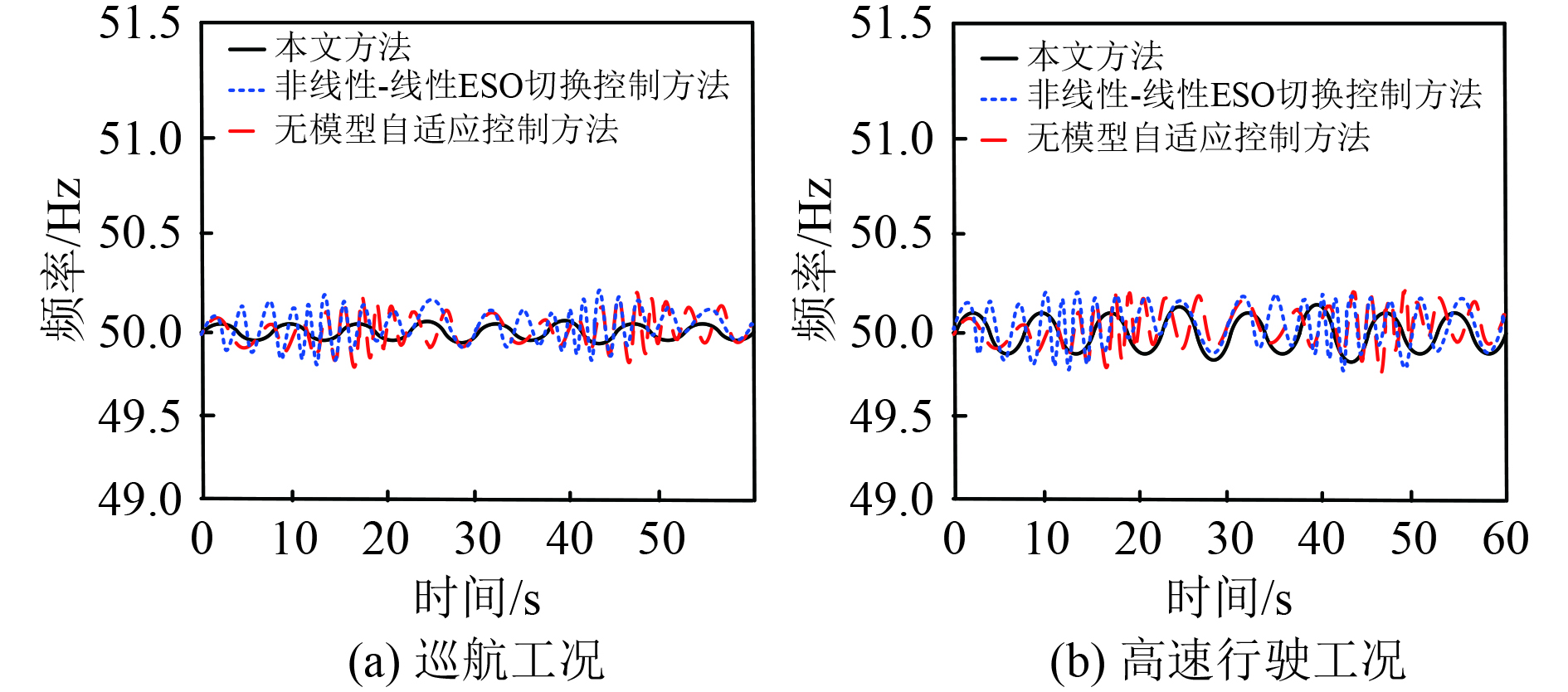 可知,在实验船舶巡航行驶工况下,本文控制器控制后的实验船舶发动机电路输出频率均可保持在49.8~50.2 Hz之间;在高速行驶工况下,非线性-线性ESO切换控制方法、无模型自适应控制方法存在部分频率超出此区间的情况,未能满足实验船舶发动机的频率波动≤±0.2 Hz的要求;另外,2种行驶工况下,本文控制器控制后实验船舶发动机的电路输出频率均更为稳定,波动幅度相对更小。