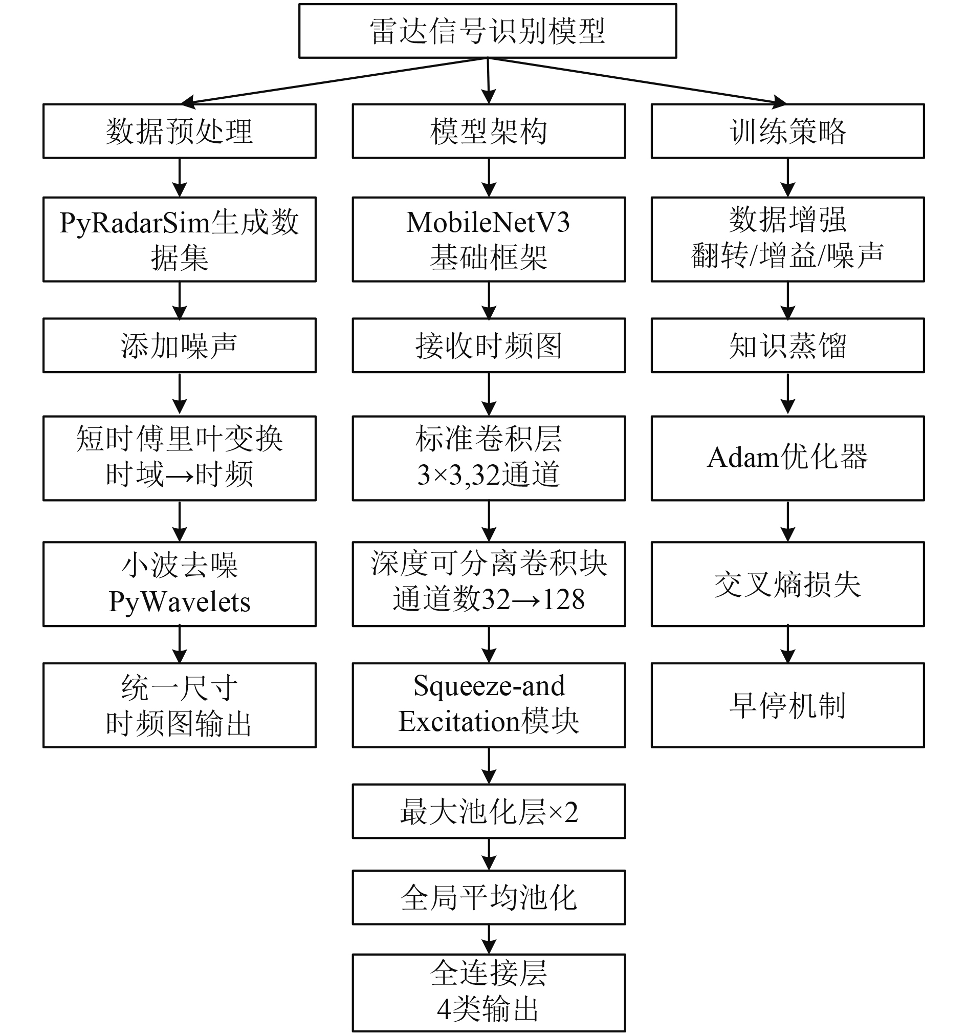 1 轻量化雷达信号识别模型的构建构建轻量化雷达信号识别模型如图1所示,首先从信号预处理环节入手,依托Python生态工具链完成数据准备与特征转化。采用PyRadarSim生成涵盖LFM/BPSK/QPSK/FSK典型调制类型的雷达信号数据集,生成过程中同步引入不同强度噪声以模拟复杂电磁环境,确保数据覆盖实战中常见的信号特征分布[6]。针对原始雷达信号时域特征辨识度低的问题,通过SciPy库实现短时傅里叶变换将时域信号转化为二维时频图,同时利用PyWavelets库进行小波去噪处理,在保留信号关键纹理特征的前提下降低环境噪声干扰,最终输出尺寸统一的时频图作为模型输入,既适配后续卷积网络的特征提取需求,又避免冗余信息增加模型计算负担。