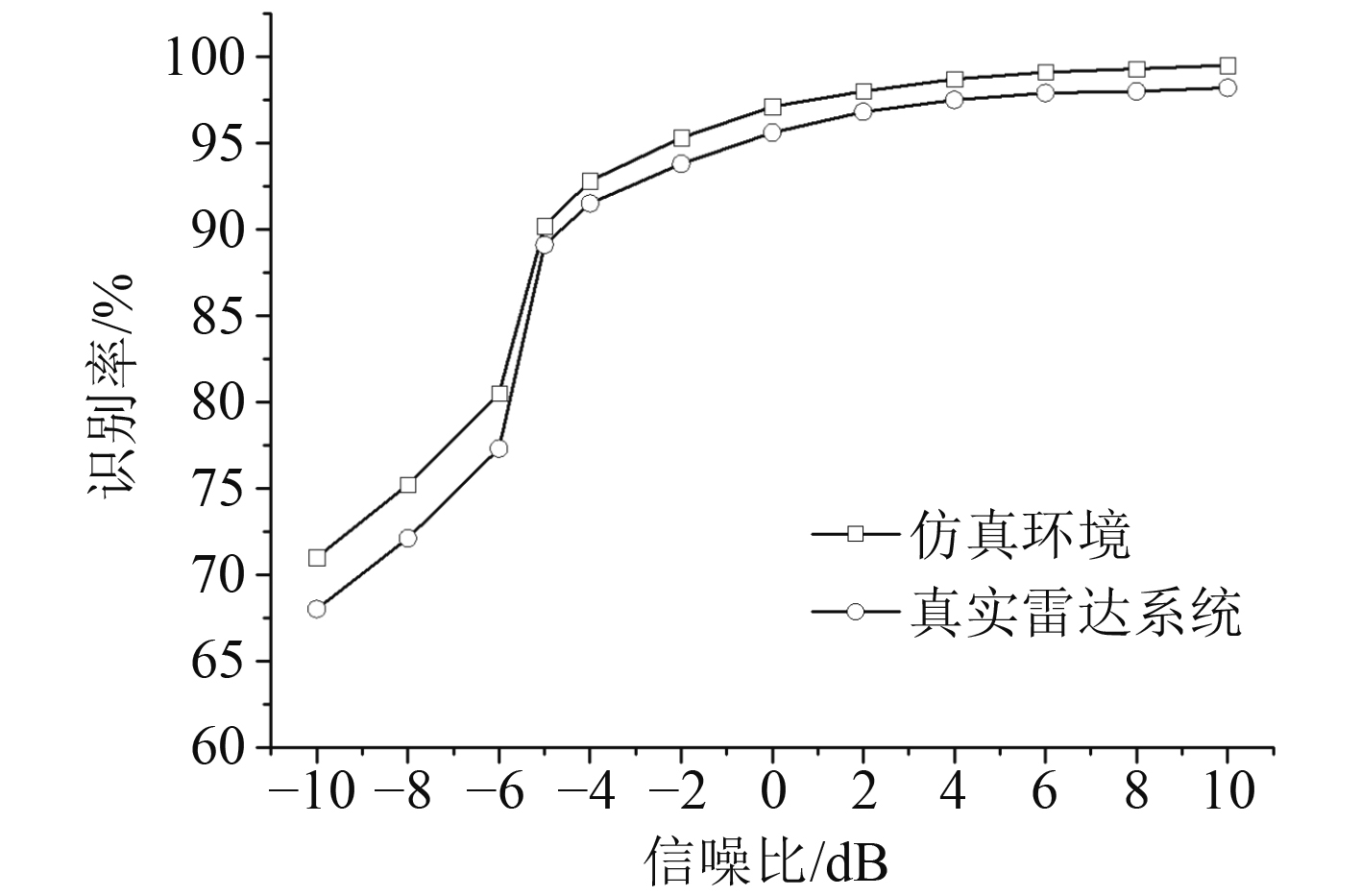 可以看出,当信噪比从−10 dB变化到10 dB过程中,仿真环境下电子侦察识别率从71.0%逐步攀升至99.5%,真实雷达系统下识别率从68.0% 升至98.2%;真实系统识别率略低于仿真环境,主要因真实电磁环境中的多径效应、非高斯噪声对信号特征造成干扰。