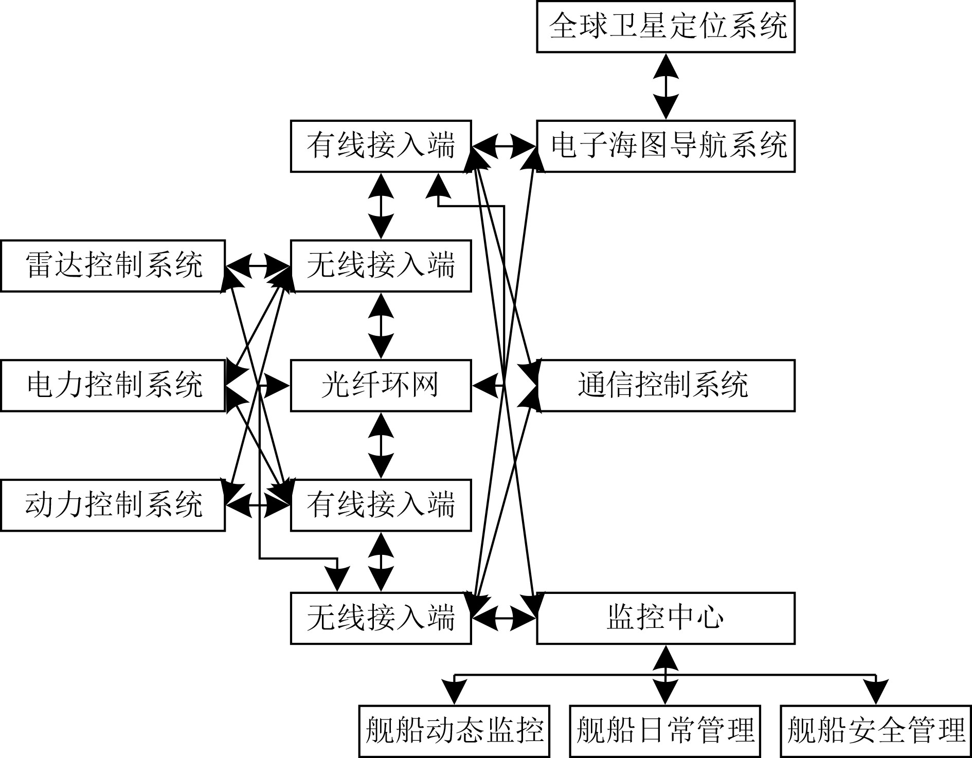 1 舰船光纤通信流量预测 1.1 舰船光纤通信网络结构舰船光纤网络的工作模式为多系统(雷达、导航、动力等)协同工作模式,其结构为环形,可以实现有线或无线的信息传输功能。通过了解舰船光纤网络结构,不仅能为流量数据提供物理层面的解释,还能指导PSO-RBFNN模型的特征选择、参数优化和适应性设计,确保预测方法能够针对舰船通信特有的高实时性、容错性需求进行优化,提升舰船通信网络流量预测精度。舰船光纤通信网络结构如图1所示。光纤环网的抗干扰能力较强,信息传输的可靠性较优,信息传输速度较快,占用空间较小,可解决舰船通信空间受限,以及电磁环境复杂的问题。通过它连接雷达控制系统与电子海图导航系统等重要系统,确保数据在不同系统间高速、可靠传输,满足舰船在复杂海况下的协同控制需求。