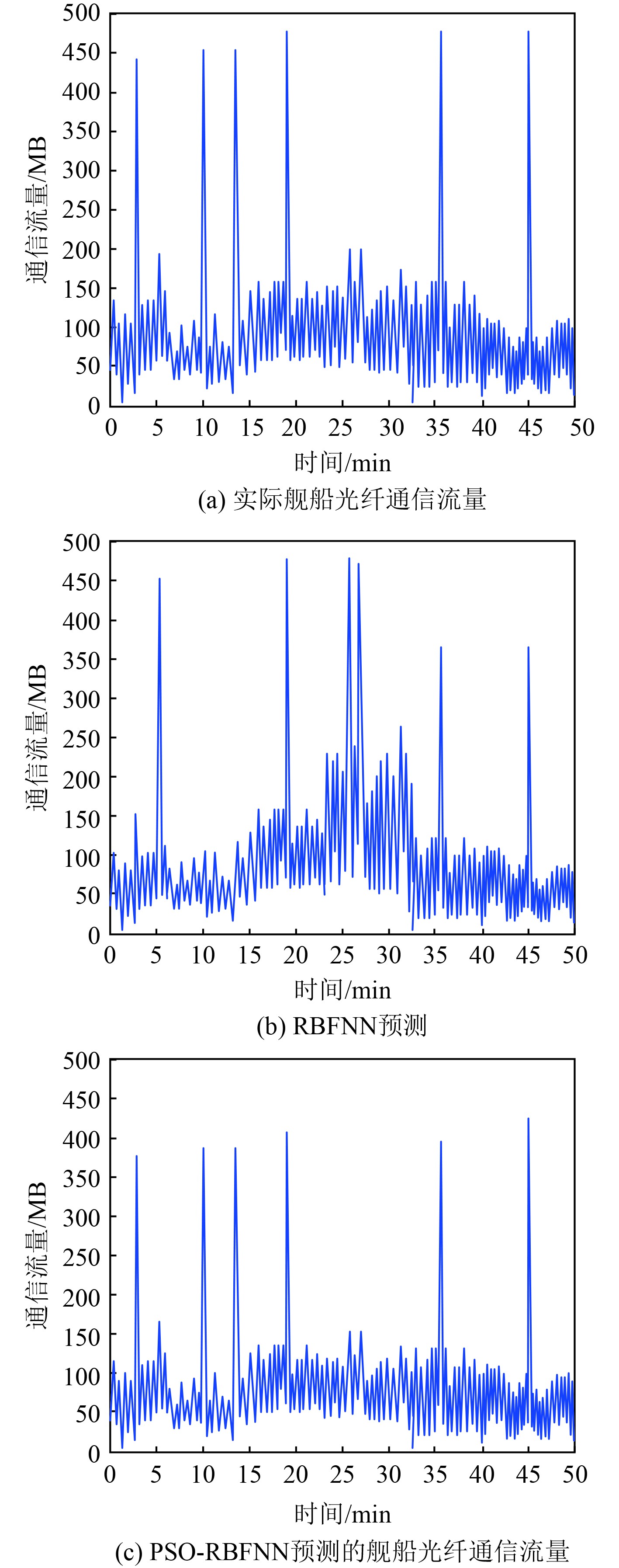 图4(c)为基于PSO-RBFNN的舰船光纤通信流量预测结果,PSO算法调整RBFNN的参数,使其能更精准地拟合多周期叠加和突发流量。相比RBFNN,PSO-RBFNN的预测曲线在突发流量处更接近真实值,表明优化后的模型对动态冲击性具有更强的适应性。高频波动部分的预测误差显著降低,说明PSO优化后的RBFNN能更好地分离不同系统的周期特征。