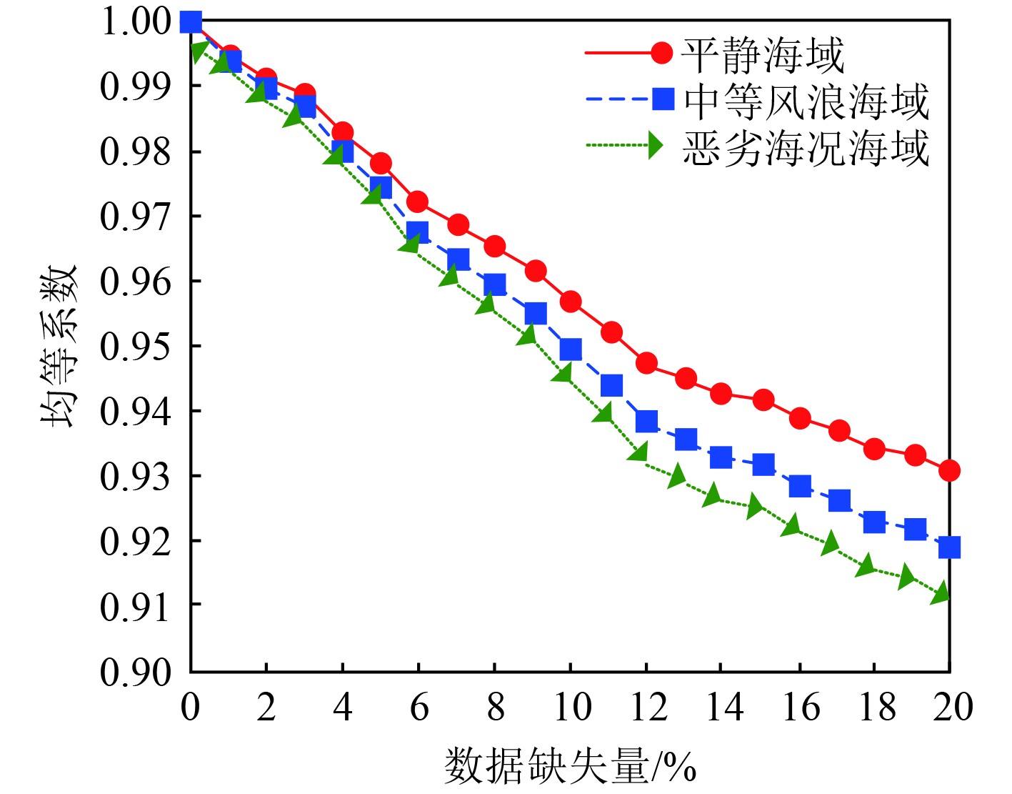 通过均等系数衡量本文方法的舰船光纤通信流量预测精度,该系数代表预测值和实际值之间的拟合度,其值与预测精度具有正相关关系,当均等系数大于0.9时,则舰船光纤通信流量预测精度较高,分析结果如图5所示。可知,在不同舰船航行环境下,随着数据缺失量的增加,本文方法舰船光纤通信流量预测的均等系数均呈下降趋势,表明数据缺失会降低预测精度。但即使在20%数据缺失时,3种环境下的均等系数均仍高于0.9(平静海域的最小均等系数约为0.93,中等风浪海域的最小均等系数约为0.92,恶劣海况海域的最小均等系数约为0.91),说明PSO-RBFNN模型具有较强容错能力。