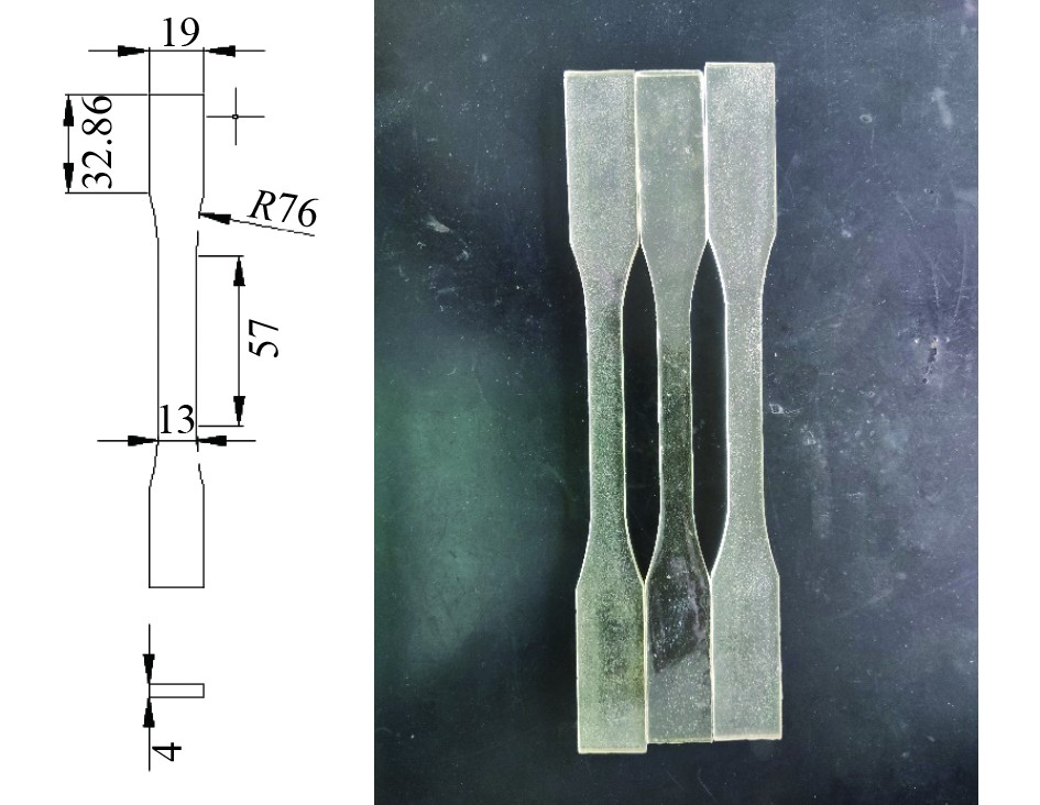 树脂基体试件形状及尺寸参考规范ASTM D638-14《塑料拉伸性能的标准测试方法》,试件为呈哑铃形状的薄板,具体尺寸及实际试件如图1所示。在试件中心位置布置1枚0°及90°的双向应变片,将试件安装于试验机夹头中,以5 mm/min的速度对树脂基体试件匀速拉伸直至试件断裂,根据试验机采集的试件破坏前承受的最大载荷确定树脂基体材料的拉伸强度,并根据所布置应变片采集到的拉伸过程中的应变确定树脂基体材料的应变-应力响应,以此获取拉伸模量。