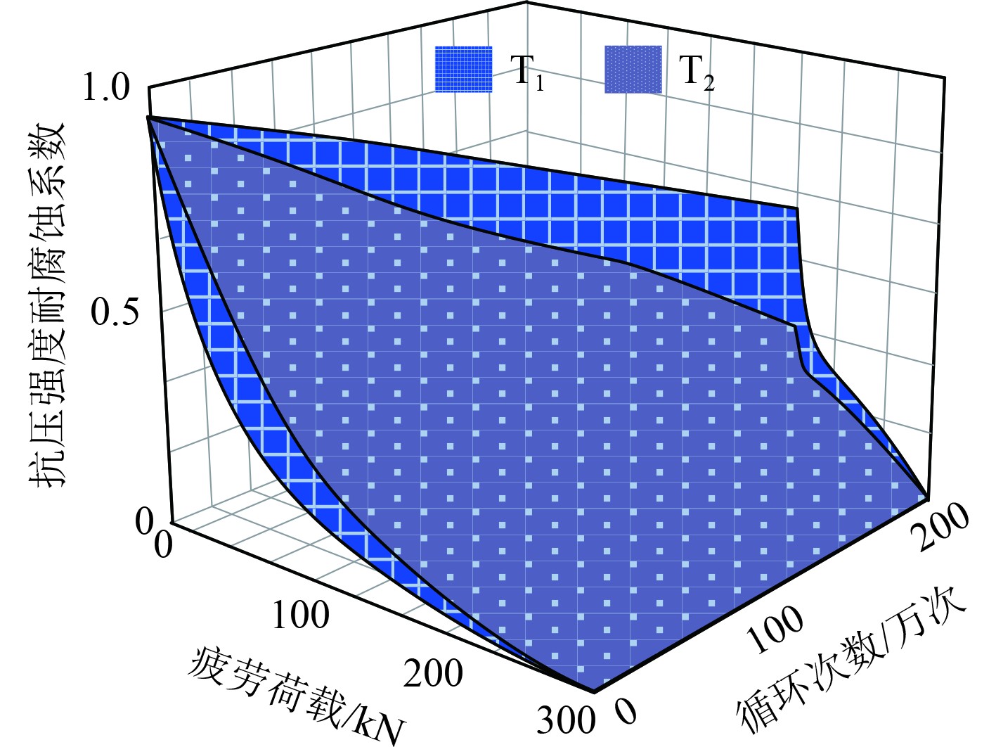 依据海洋腐蚀-疲劳耦合试验方法对T1和T2两种舰船甲板特种混凝土样本的抗压强度耐腐蚀系数,计算结果如图2所示。