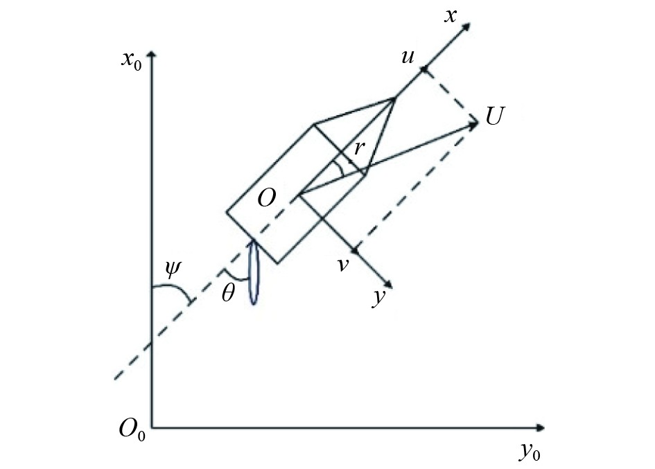 | $ \left\{\begin{aligned} & \dot{x}=u\mathrm{cos}\varPsi-v\mathrm{sin}\varPsi,\\ & \dot{y}=u\mathrm{sin}\varPsi+v\mathrm{cos}\varPsi,\\ & \dot{\varPsi}=r,\\ & \left(m+m_x\right)\dot{u}-\left(m+m_y\right)vr=X_H+X_P+X_R,\\ & (m+m_y)\dot{v}-(m+m_x)ur=Y_H+Y_P+Y_R,\\ & (I_{ZZ}+J_{ZZ})\dot{r}=N_H+N_P+N_R。\end{aligned}\right. $ | (1) |