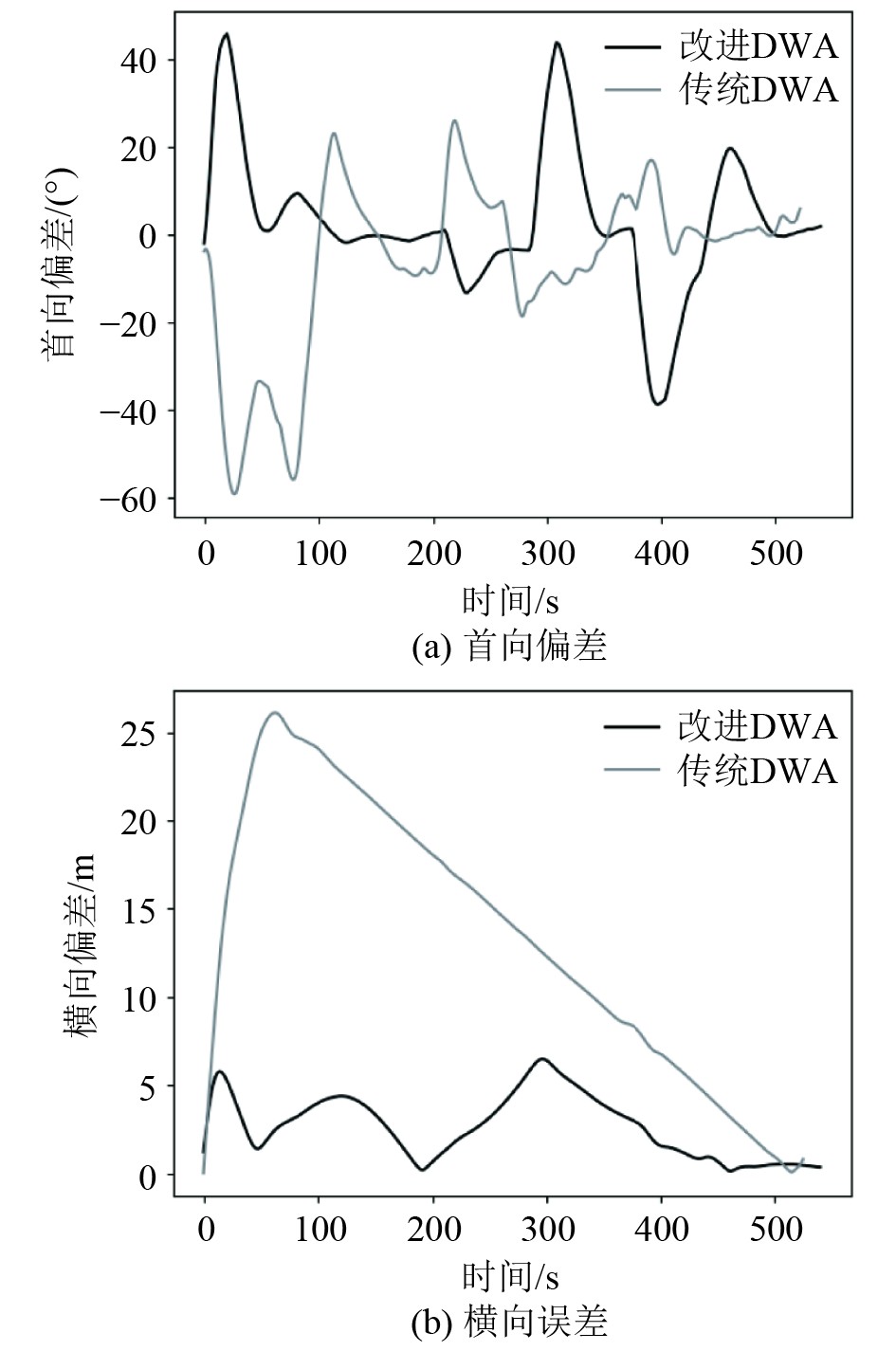 3.3 循迹仿真试验为进一步验证规划轨迹的可行性,利用LOS循迹算法对相同引导点策略下传统DWA与改进DWA的规划轨迹进行了循迹控制仿真。本文选择艏向偏差和横向误差作为评价指标,艏向偏差是欠驱船船艏方向与期望航向之间的夹角差,用于评估欠驱船在航行过程中是否能始终保持正确的航向。横向误差是欠驱船当前位置与期望路径之间的垂直距离,用于评估欠驱船偏离期望路径的程度。仿真结果与偏差变化如图9~图10所示。