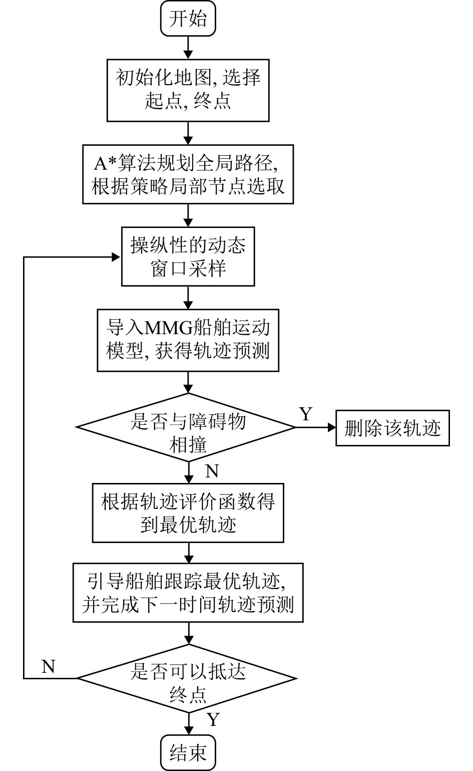 2 考虑操纵性约束的轨迹规划方法本文提出了一种融合A*算法和改进动态窗口法的轨迹规划方法,算法流程如图2所示。首先根据用户输入的起点、终点,通过A*算法生成全局路径,并根据策略选取局部节点;其次在单位采样时间内构建包含所有可行舵角和转速的操纵空间,并根据采样频率离散出可行的舵角和转速集合。对于每一组可行操纵输入,利用MMG运动学模型预测其运动轨迹并通过评价函数对其进行评估,选择最优操纵指标作为控制器的参考输入。最后,在后续采样时间内不断重复此过程,直至欠驱船舶抵达终点。