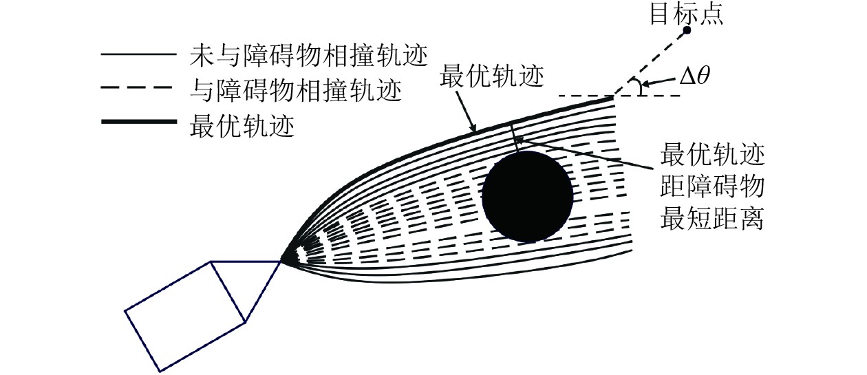 确定了欠驱船舶轨迹预测范围后,改进算法在预测轨迹后首先进行碰撞检测。对于环境中存在的障碍物,如果预测轨迹与障碍物发生碰撞,则将相应的预测轨迹丢弃。在筛除所有存在碰撞风险的轨迹后,本方法使用轨迹评价函数对剩余轨迹进行量化评价,并循环选取连续的最优轨迹组合直至到达终点作为轨迹规划结果(见图3)。