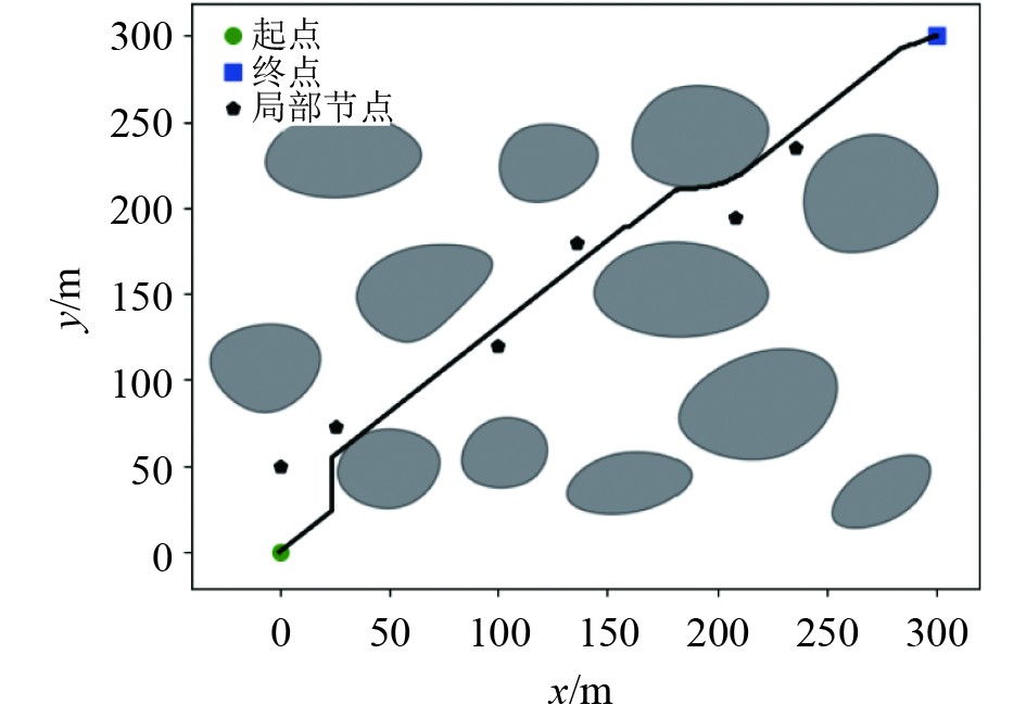A*算法在静态环境中性能较优,稳定收敛。本文方法结合了基于A*的全局路径规划方法,通过选取、修改A*路径关键节点引导局部轨迹优化,提升算法的全局规划能力。为得到用于局部路径规划的关键节点,首先通过一种冗余点删除策略[10],即删除同一条线上的冗余点和路径上无障碍物2个路径节点之间的冗余点。A*算法生成的全局最优路径进行冗余点删除,使优化后的全局路径仅保留起点、终点和必要的关键节点。冗余点删除后的规划路径不会穿过障碍物的顶点,这避免了“智能体”在运动过程中与障碍物发生碰撞。但欠驱船舶操纵较为困难,且有其最短回转半径,基于A*算法优化后的路径可能无法满足欠驱船舶的转艏要求,存在路径无法跟踪的情况,且可能不满足欠驱船舶航行中避碰的最短安全距离。