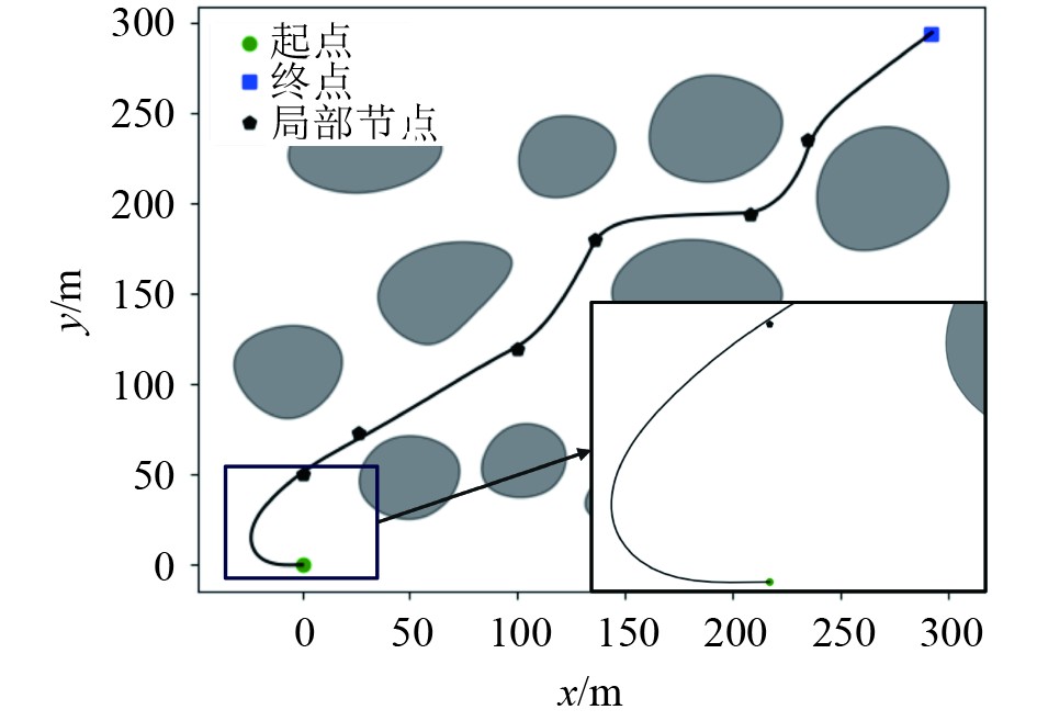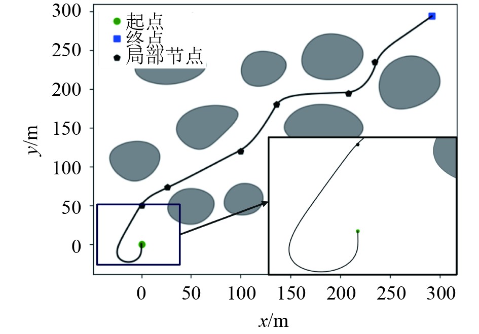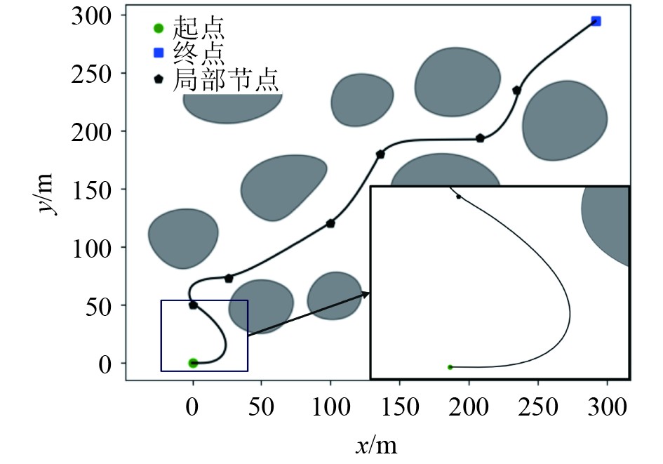 欠驱船相较于其他载具在运动控制上存在更多的约束,通常无法直接控制横向位移和偏航角速度,在规划过程中如果没有考虑欠驱船舶运动学模型的整体约束,规划的参考轨迹不一定满足其操纵性要求,导致跟踪参考轨迹失败。因此针对欠驱船舶的轨迹规划,需要结合其运动学特性设计改进算法。目前,国内外学者在欠驱船舶轨迹规划方面的研究较为有限。Miyauchi等[3]提出一种基于随航速变化的船舶避碰算法,解决考虑障碍物的靠泊轨迹规划问题,该算法将空间约束纳入优化,但其使用的船舶运动模型较为简单,导致轨迹难以跟踪。祁新宇等[4]提出一种基于多项式混沌展开法的船舶鲁棒轨迹规划方法,并使用遗传算法优化控制量与轨迹,但该方法仅在简单的避碰场景中进行了验证。高双等[5]提出一种可保证欠驱动水面船全时可跟踪的轨迹规划方法,重点解决欠驱动水面船任意初始状态下规划轨迹的可跟踪性与安全问题;李晔等[6]结合欠驱动船舶运动特性和障碍物参数,提出了基于多约束分析的轨迹规划方法。但上述2种方法均未考虑欠驱船与障碍物间的安全距离,导致规划轨迹碰撞风险较大。总的来说,在障碍物密集的复杂水域中,当前的欠驱船轨迹规划研究仍较为薄弱,现有方法难以同时兼顾欠驱船舶的运动特性与规划轨迹的安全性,导致轨迹规划结果难以直接执行。