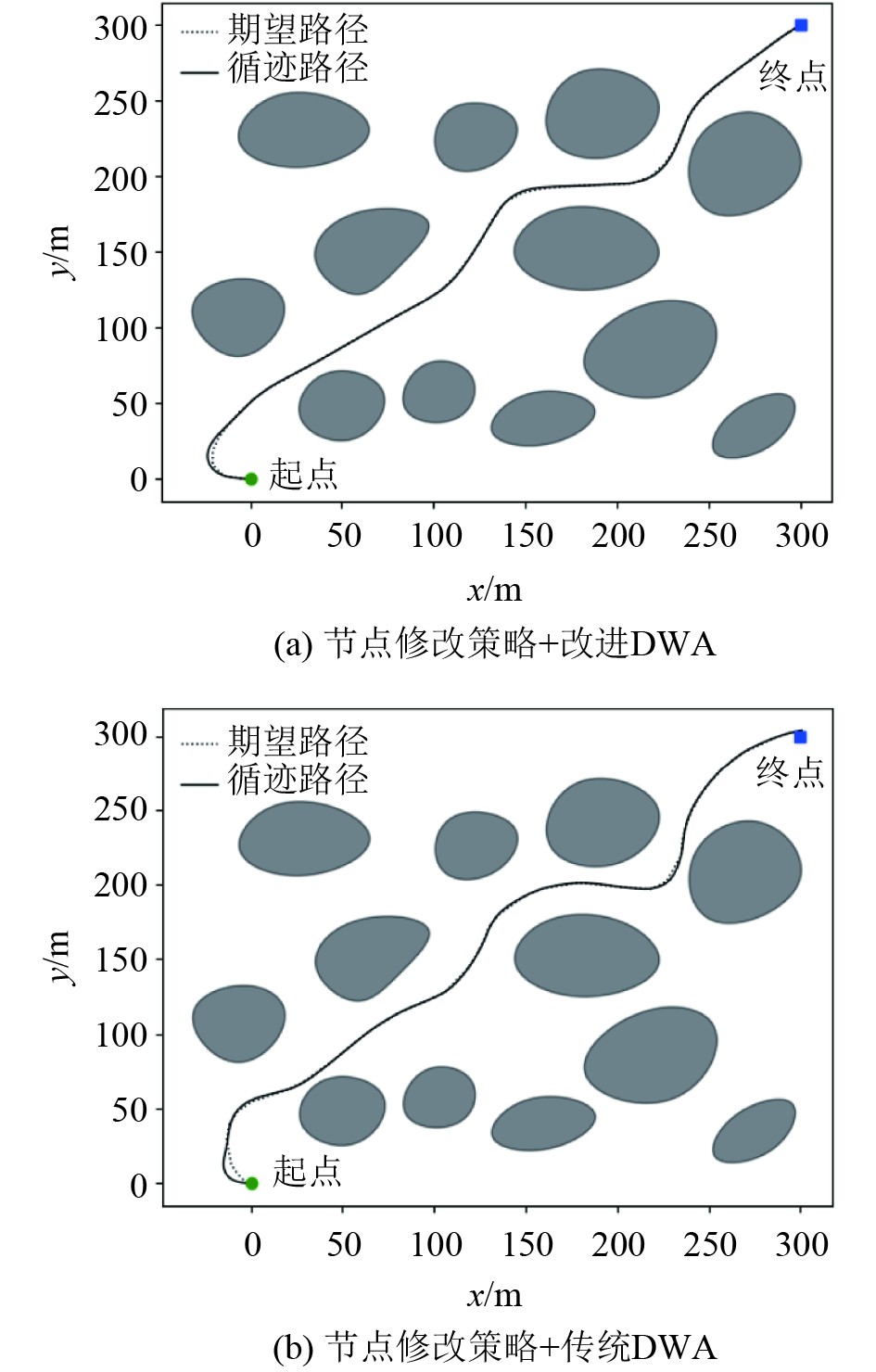 为验证引入MMG运动模型的融合A*和改进动态窗口法的轨迹规划方法的有效性和优越性,在不同起始姿态约束下利用该方法进行轨迹规划仿真,与其它不同算法进行数值对比,并利用循迹算法对规划轨迹进行循迹。本文以7米级的KVLCC2国际标模为模型开展仿真实验,该船主要模型参数如下:船长为7.0 m;船宽为1.27 m;吃水深度为0.455 m;螺旋桨直径与舵距之比为0.626。模拟环境地图尺寸为350 m×350 m,起点坐标为(0,0),终点坐标为(300,300)。算法参数设置如下:最大转速