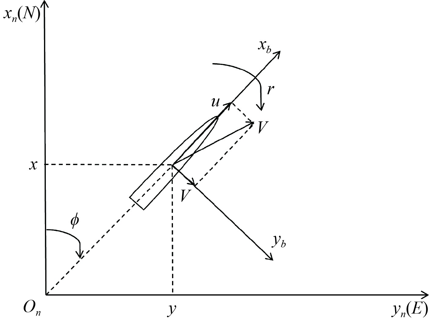 | $ \left\{ {\begin{aligned} { \begin{gathered} {\boldsymbol{J(\eta )}} = \left( {\begin{array}{*{20}{c}} {\cos \phi }&{ - \sin \phi }&0 ,\\ {\sin \phi }&{\cos \phi }&0 ,\\ 0&0&1 \end{array}} \right), \\ {\boldsymbol{M}} = \left( {\begin{array}{*{20}{c}} {m - X\dot u}&0&0 \\ 0&{m - Y\dot v}&{m{x_g} - Y\dot v} \\ 0&{m{x_g} - Y\dot r}&{{I_z} - N\dot r} \end{array}} \right) ,\\ {\boldsymbol{C(\nu )}} = \left( {\begin{array}{*{20}{c}} 0 & 0 & { - m({x_g}r + v) + Y\dot vv + Y\dot rr} \\ 0 & 0 & {mu - X\dot uu} \\ {m({x_g}r + v) - Y\dot vv - Y\dot rr} & { - mu + X\dot uu} & 0 \end{array}} \right),\\ {\boldsymbol{D}} = - \left( {\begin{array}{*{20}{c}} {{X_u}}&0&0 \\ 0&{{Y_v}}&{{Y_r}} \\ 0&{{N_V}}&{{N_r}} \end{array}} \right), \\ {{\boldsymbol{D}}_{\boldsymbol{n}}}{\boldsymbol{(\nu )}} = - \left( {\begin{array}{*{20}{c}} {{X_{\left| u \right|u}}\left| u \right|}&0&0 \\ 0&{{Y_{\left| v \right|v}}\left| v \right| + {Y_{\left| v \right|r}}\left| r \right|}&{{Y_{\left| v \right|r}}\left| v \right|} \\ 0&{{N_{\left| v \right|v}}\left| v \right| + {N_{\left| v \right|r}}\left| r \right|}&{{N_{\left| v \right|r}}\left| v \right| + {N_{\left| r \right|r}}\left| r \right|} 。\end{array}} \right)。\\ \end{gathered} } \end{aligned}} \right.$ | (2) |