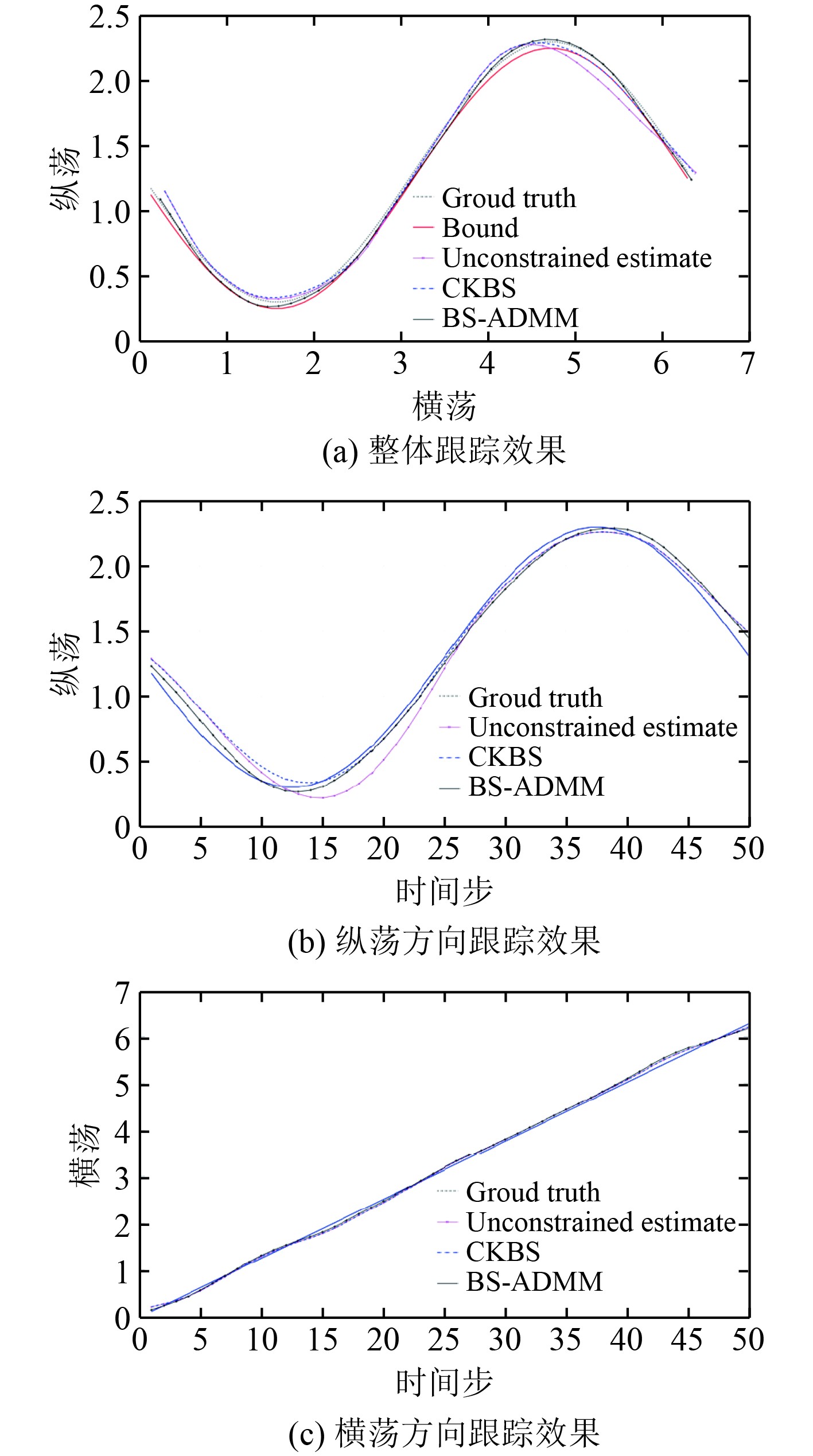 路径跟踪的效果如图2所示,图中展示了二维平面内的轨迹跟踪效果,以及纵荡和横荡方向上的跟踪效果对比。从图中可以看出,基于约束的BS-ADMM相比无约束条件下的方法,能够更有效地跟踪实际轨迹。并且BS-ADMM方法在跟踪精度上显著优于传统的约束卡尔曼-布什滤波(CKBS)方法,展现了其在复杂路径跟踪问题中的优越性能。