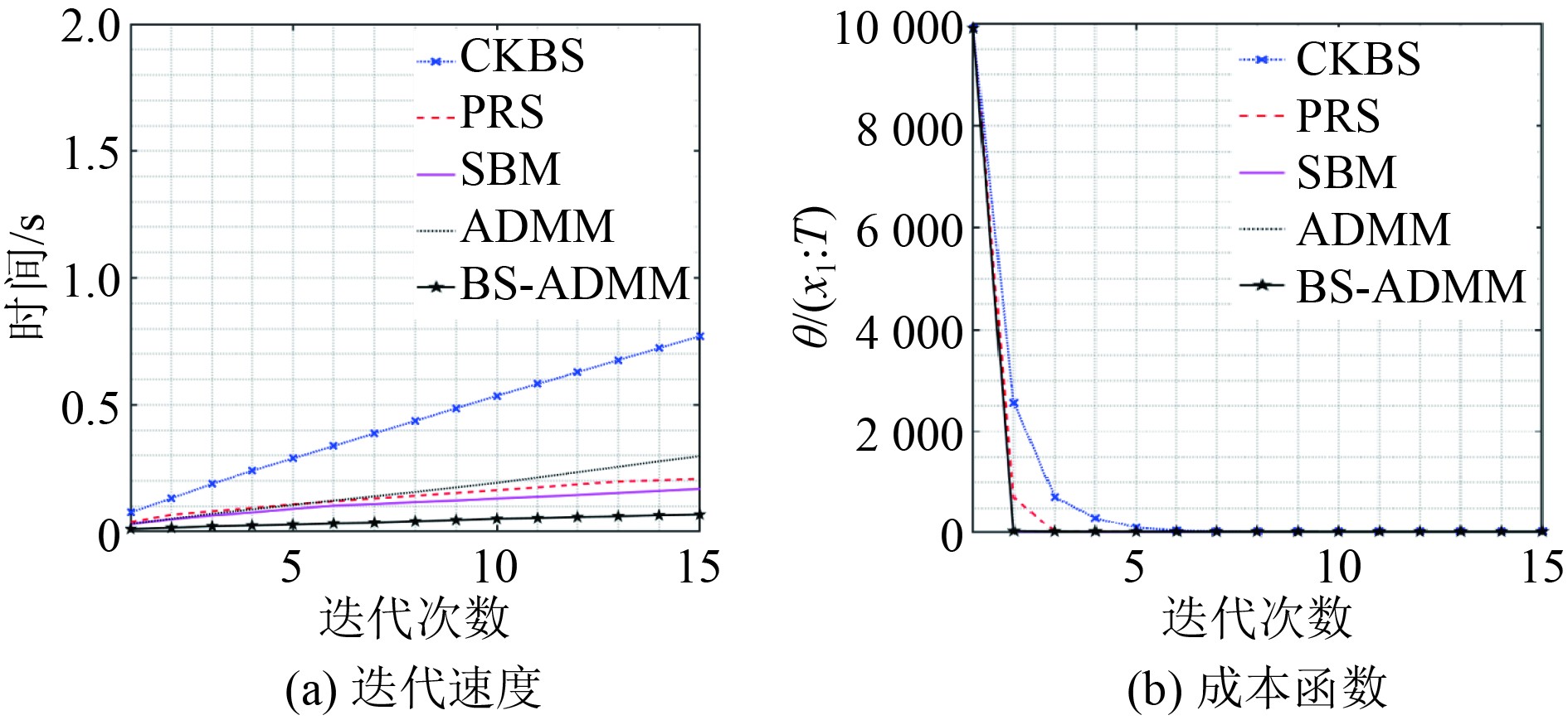 邻近正则化子问题方法(Proximal Regularized Subproblem,PRS)和分裂Bregman方法(Splitting Bregman Method,SBM)是2种变量分离方法,其中PRS通过引入邻近正则化项改进收敛性能,适用于非线性优化问题;而SBM利用Bregman距离分解变量,提高求解稀疏和分段线性问题的效率,两者都被用于路径跟踪问题研究中[19]。本文将提出的BS-ADMM与其他变量分割方法PRS、SBM结合方法的代价函数值与迭代速度的关系如图3所示。可以发现,基于BS-ADMM的方法迭代次数少,迭代速度快,相比其他的滤波方法和变量分离法,迭代速度平均约提高了65%。能够有效解约束状态估计问题,大大降低了估计的时间成本。