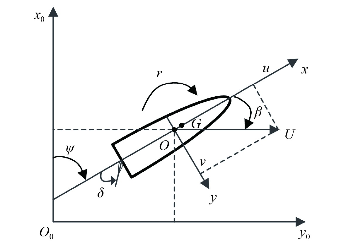 | $ \left\{\begin{aligned} & \dot{x}=u\cos\left(\psi\right)-v\sin\left(\psi\right),\\ & \dot{y}=u\sin\left(\psi\right)+v\cos\left(\psi\right),\\ & \dot{\psi}=r,\\ & \dot{u}=\displaystyle\frac{m_{22}}{m_{11}}vr-\displaystyle\frac{d_{11}}{m_{11}}u+\displaystyle\frac{1}{m_{11}}\delta_T,\\ & \dot{v}=\displaystyle\frac{m_{11}}{m_{22}}ur-\displaystyle\frac{d_{22}}{m_{22}}v,\\ & \dot{r}=\displaystyle\frac{m_{11}-m_{22}}{m_{22}}uv-\displaystyle\frac{d_{33}}{m_{33}}r+\displaystyle\frac{1}{m_{33}}\delta_r。\end{aligned}\right. $ | (4) |