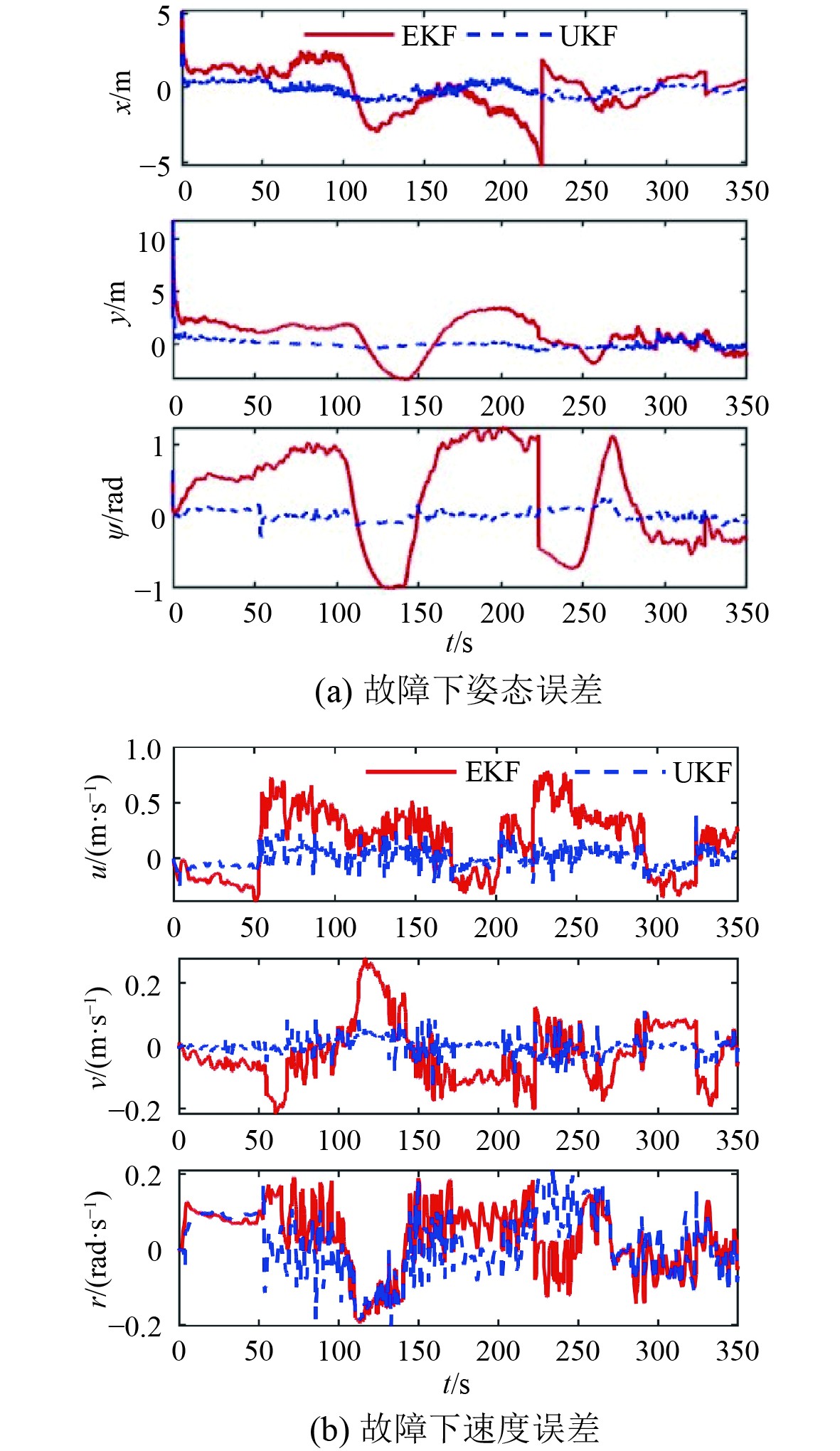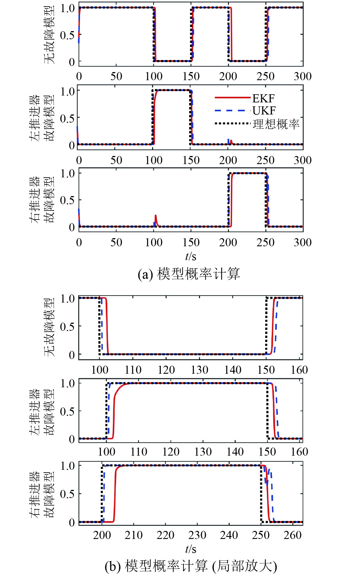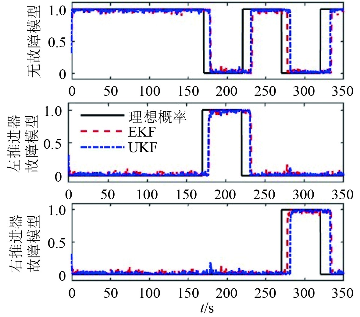 由图7(a)可见,在0~100 s、150~200 s、250~300 s期间,系统处于无故障状态,无故障模型的概率稳定为1,而左推进器和右推进器故障模型的概率均为0。在100~150 s期间,左推进器发生故障,对应故障模型的概率迅速收敛至1,而无故障模型和右推进器故障模型的概率下降至0。同理,在200~250 s期间,右推进器发生故障,此时右推进器故障模型的概率上升至1,而无故障模型和左推进器故障模型的概率均降为0。从图7(b)可以观察到,UKF在故障诊断中的响应速度快于EKF,能够更迅速地检测到故障的发生。
