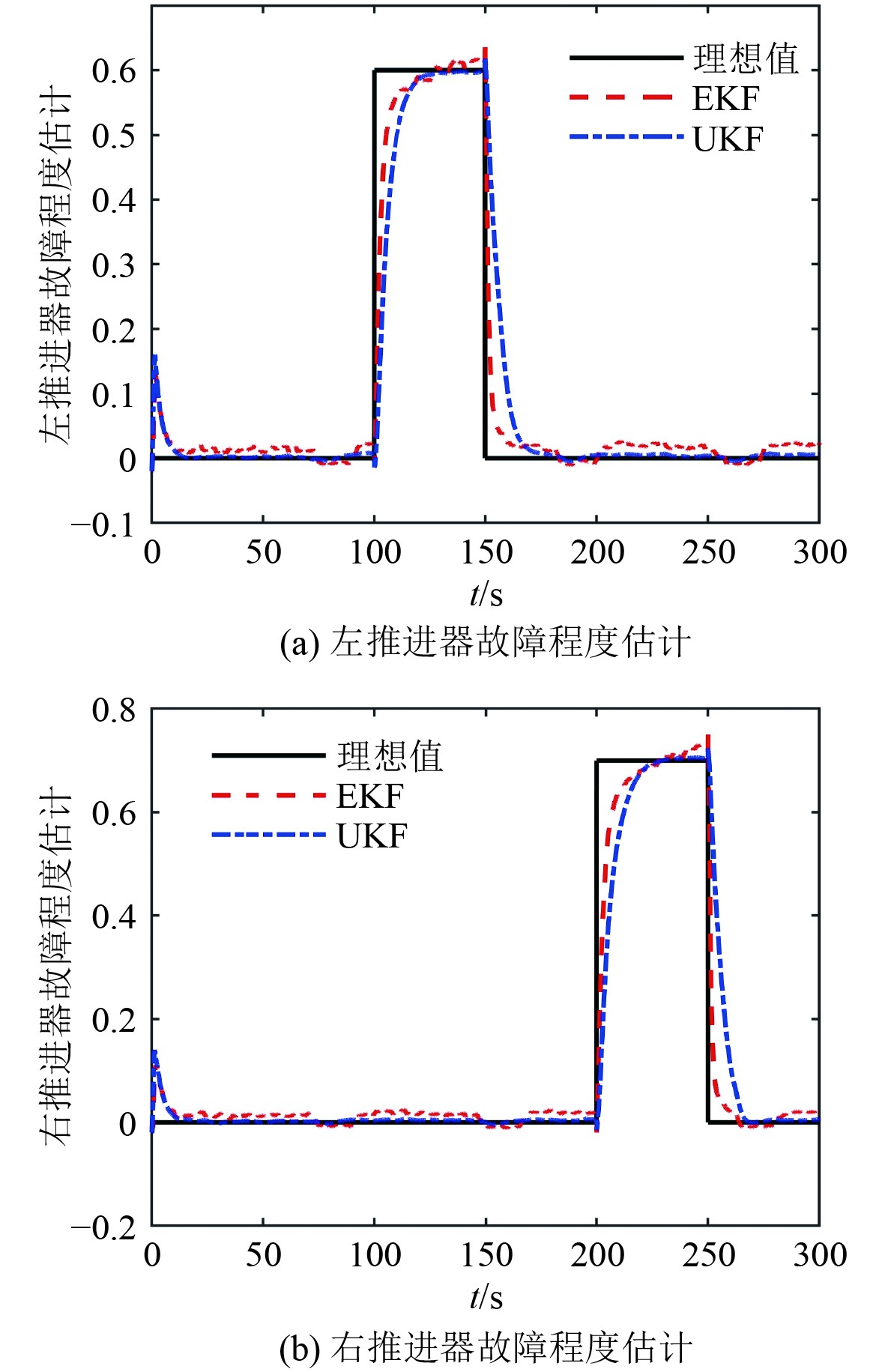 推进器故障程度估计结果如图12所示。与左推进器故障相比,右推进器70%的推力损失系统动态响应更剧烈,使得估计误差增大,但仍能较准确估计。对比基于FUKF-MMAE和FEKF-MMAE的估计结果,可以观察到FUKF-MMAE仍然在估计精度方面明显优于FEKF-MMAE,但在实际环境下,其误差波动幅度相较于仿真有所增加。