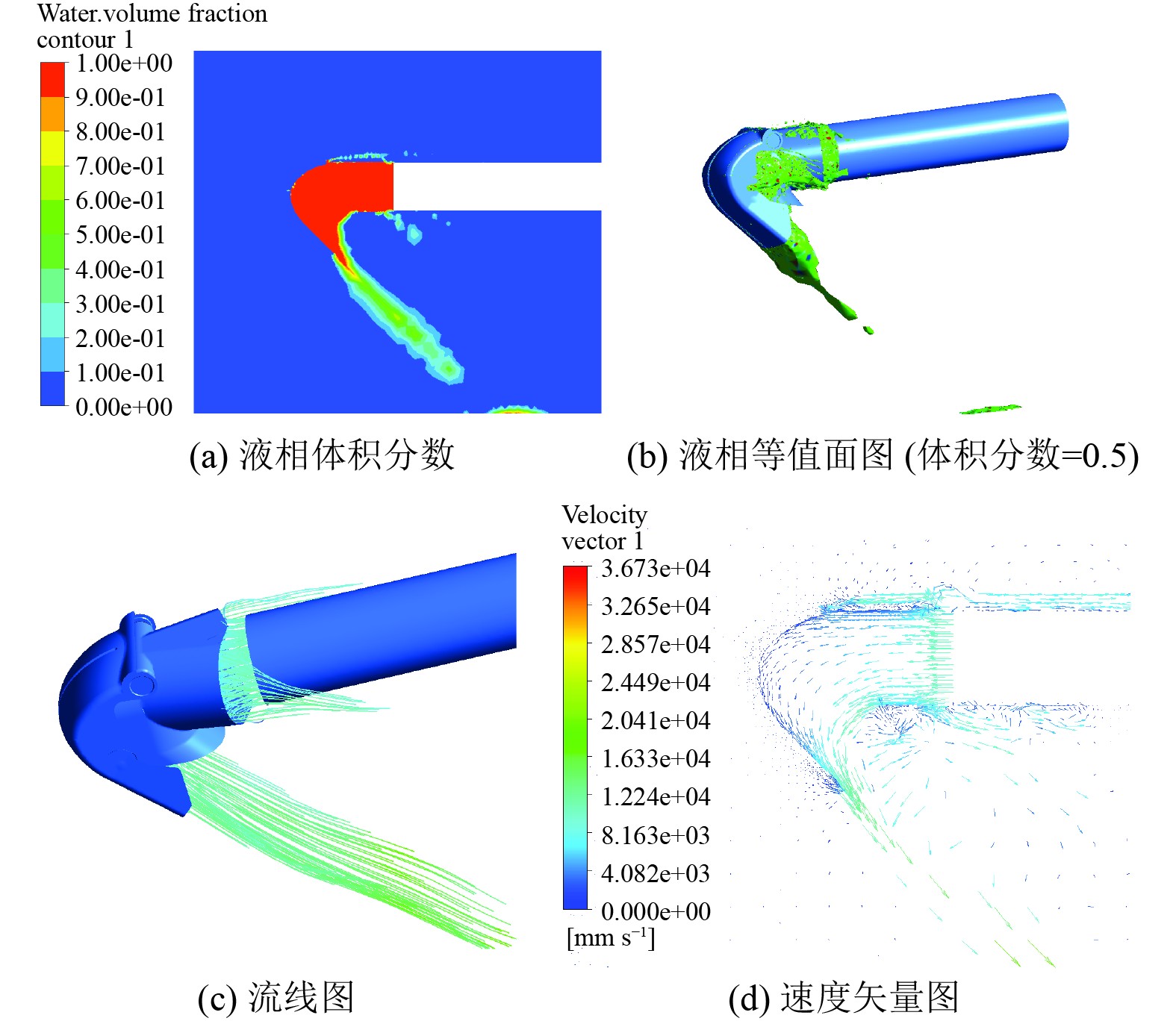 2.3 数值计算结果分析将不同喷口直径在不同流量下的纵向力进行计算,图4分别给出了操舵倒航机构在流量为0.362 m3/s条件下的液相体积分数、液相等值面(体积分数=0.5)、流线图、速度矢量图。从液相等值面图及流线图也可看出,喷口与方向舵之间产生了较大回射流,该回射流几乎与喷射水流呈180°夹角,导致操舵倒航机构所受纵向力比无喷溅水流要大。但将操舵倒航机构装于喷水推进船尾部后,该回射流正好撞击到船尾封板,因此该处的力并未对倒航产生贡献,应该在设计时尽量避免此回射流的产生。其次,从速度矢量图可看出,操舵倒航机构除倒喷水流主流方向的流速分布很不均匀,靠近倒航斗出口处倒喷速度大于入流速度,在喷射主流附近也存在其他泄漏流动。以上分析表明,用简易式(3)计算操舵倒航机构纵向力不合理。