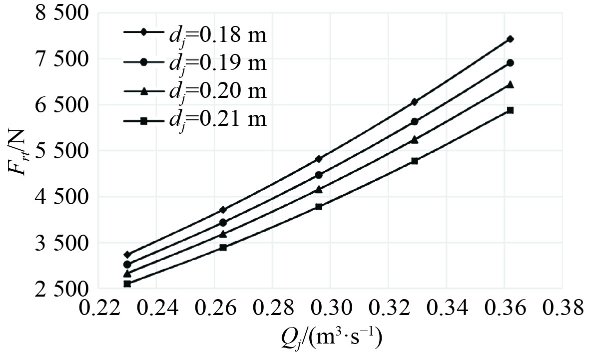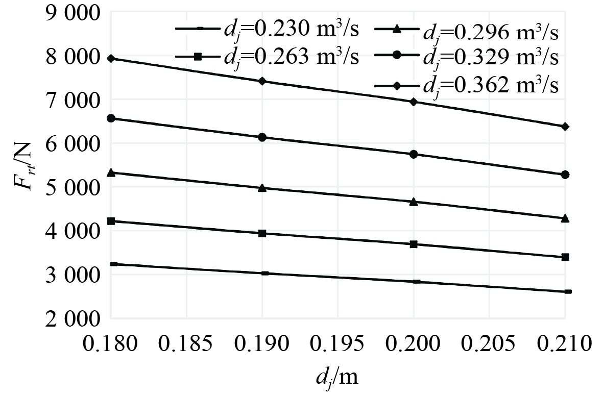 以喷口直径为横坐标,修正公式计算纵向力为纵坐标,绘制不同流量下的Frt-dj曲线,如图6所示。可看出,不同流量下,喷口直径增大,喷速变小,纵向力减小。