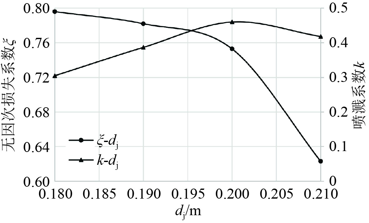 以喷口直径为横坐标,分别以无因次损失系数ξ和喷溅系数k为纵坐标,绘制ξ-dj和k-dj曲线,如图7所示。可看出,喷口直径由0.18 m增大至0.2 m附近时,ξ值由大变小,变化斜率不大,喷口直径由0.2 m增大0.21 m,ξ值减小斜率大幅增加,分析原因为倒航斗下颚最小开口处宽度为0.2 m,喷口直径由0.18 m增大至0.2 m时,流动为扩散流动,流场内流动损失较大,喷口直径越小,扩散程度越大,流动损失越大,喷口直径大于0.2 m时,流动为收缩流动,流动损失变小,ξ值相应变小。