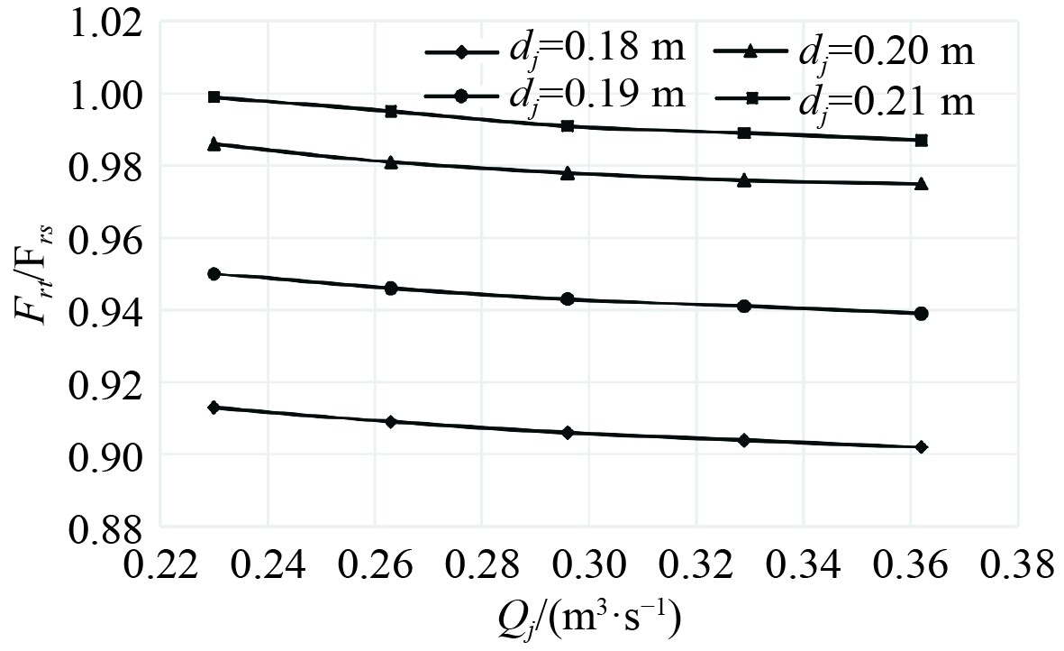 以流量为横坐标,Frt/Frs为纵坐标,绘制不同喷口直径下的Frt/Frs—Qj曲线,如图8所示。可看出,不同喷口直径下,随着Qj增大,Frt/Frs逐渐变小,式(9)也表明了这一点。