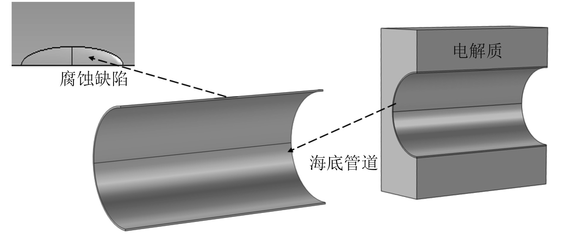 图 1 电解液中的含腐蚀缺陷的海底管道三维模型 Fig. 1 Three-dimensional model of submarine pipeline with corrosion defects in electrolyte |
