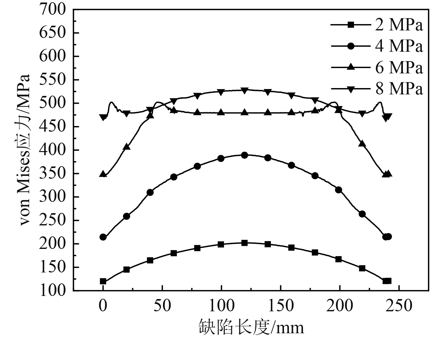 图 10 不同内压下缺陷处的von Mises应力 Fig. 10 Von Mises stresses at defects under different internal pressures |