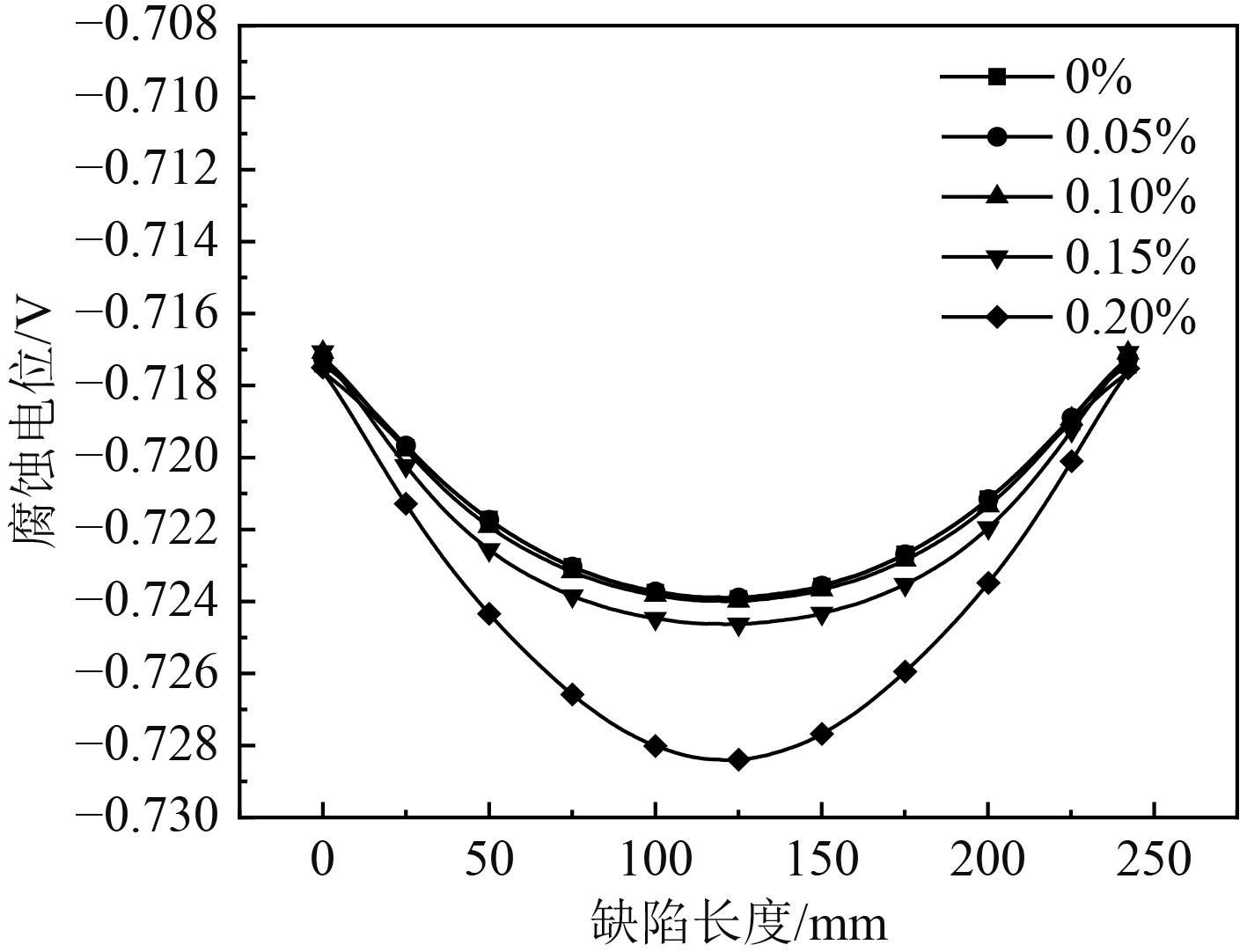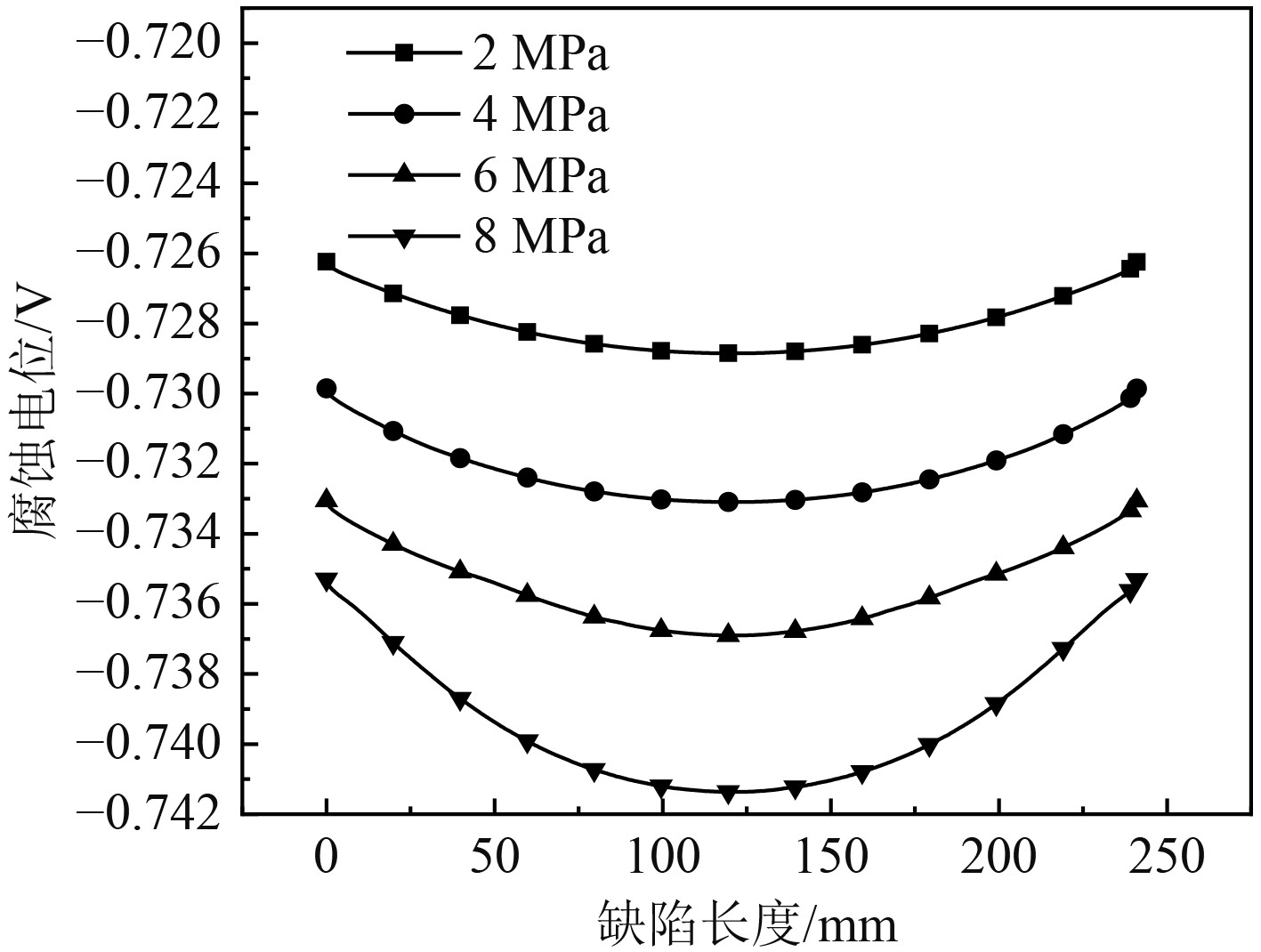 图 11 不同内压下缺陷处的腐蚀电位 Fig. 11 Corrosion potential at defects under different internal pressures |