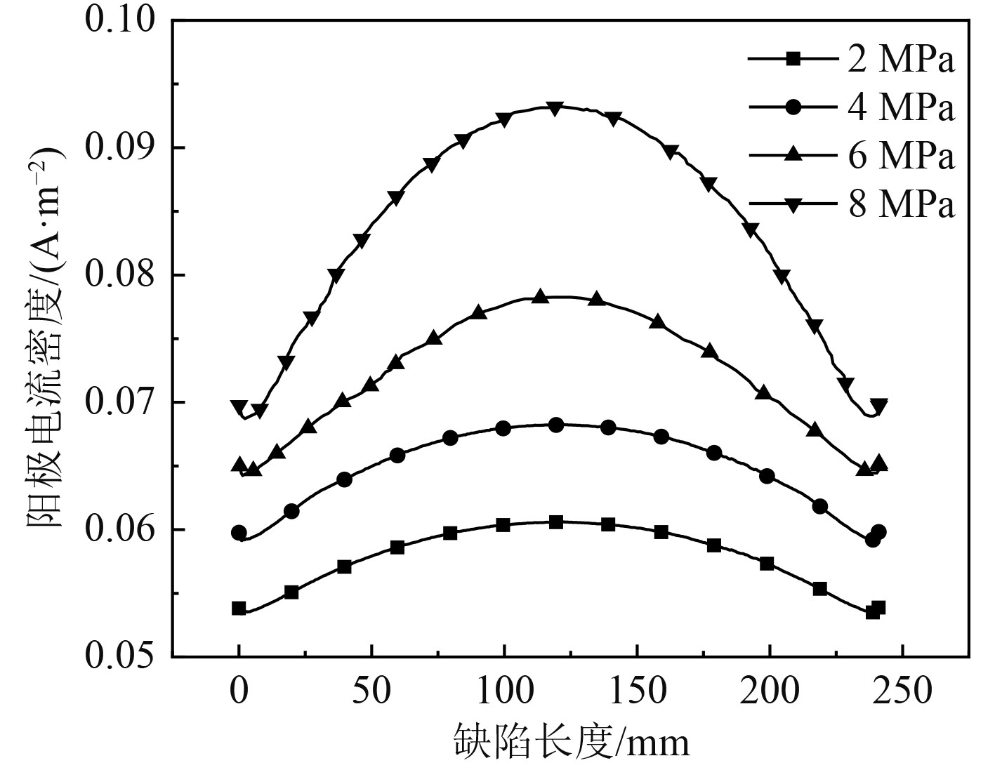 图 12 不同内压下缺陷处的阳极电流密度 Fig. 12 Anode current density at defects under different internal pressures |