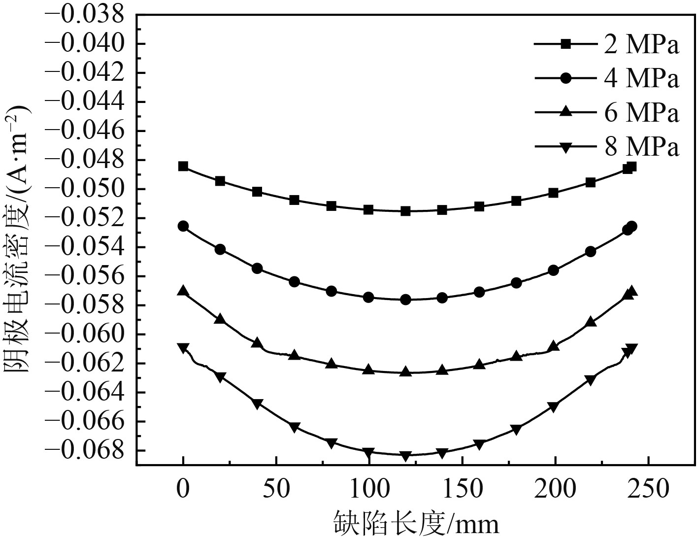 图 13 不同内压下缺陷处的阴极电流密度 Fig. 13 Cathode current density at defects under different internal pressures |