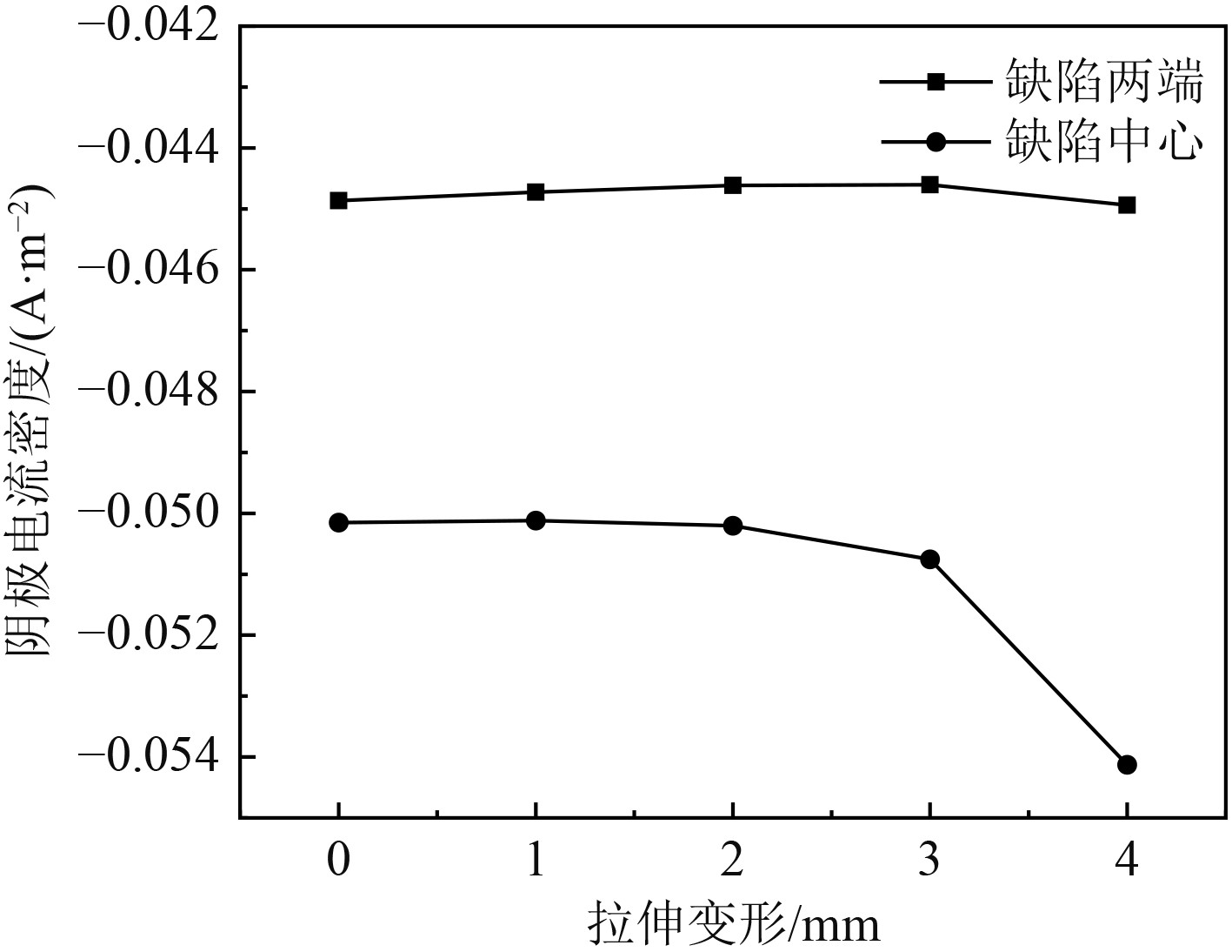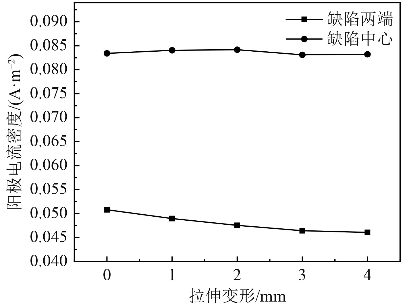 3)随着拉伸应变的增大,缺陷中心位置应力变化小,而管道两端变化显著;缺陷中心处的阳极电流密度明显大于缺陷两端,中心阴极电流密度明显小于两端。