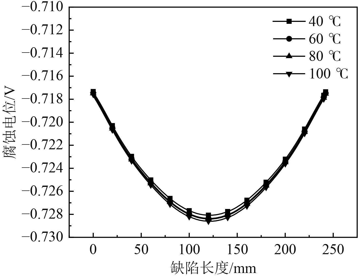 图18~图19为不同温度下的应力、腐蚀电位曲线图。由图18可知,缺陷处应力随温度的升高逐渐增大,且相同温度间隔时。40℃~60℃下应力对温度更加敏感,缺陷两端处应力相差很小。由图19可知,不同温度时,缺陷中心处腐蚀电位有一定差距,但整体上差距微乎其微。