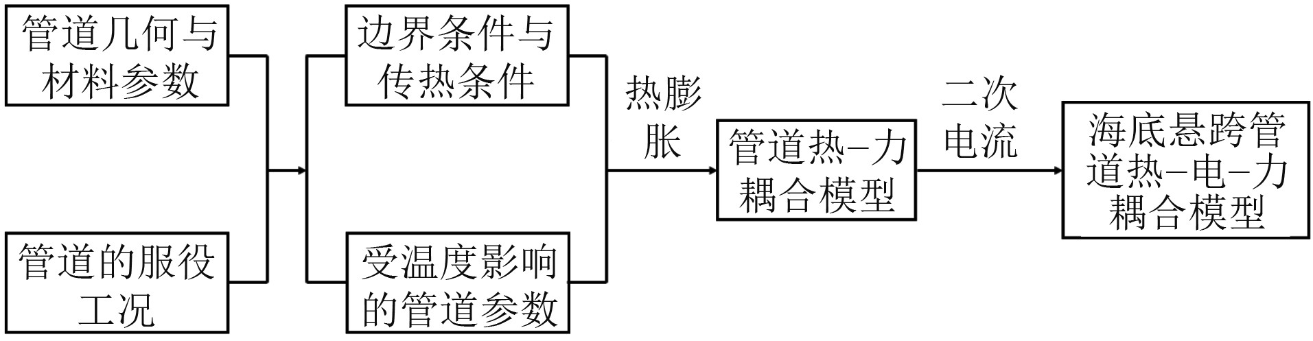 综上所述,现有针对海底悬跨管道应力腐蚀研究主要集中于一系列应力腐蚀试验和有限元模拟应力腐蚀管道电-热耦合等方面。由于海底悬跨管道运行过程中存在复杂的热-电-力多物理场耦合效应,且考虑热-电-力多物理场耦合下的海底管道应力腐蚀研究处于空白。因此,为保障海洋油气的安全输送,本文利用COMSOL建立海底悬跨管道应力腐蚀三维有限元模型,并对管道的温度场进行数值模拟,通过多物理场耦合方法对管道温度场、应力场和电化学腐蚀场进行耦合分析,研究热-电-力多物理场耦合效应下海底悬跨管道的应力腐蚀行为。