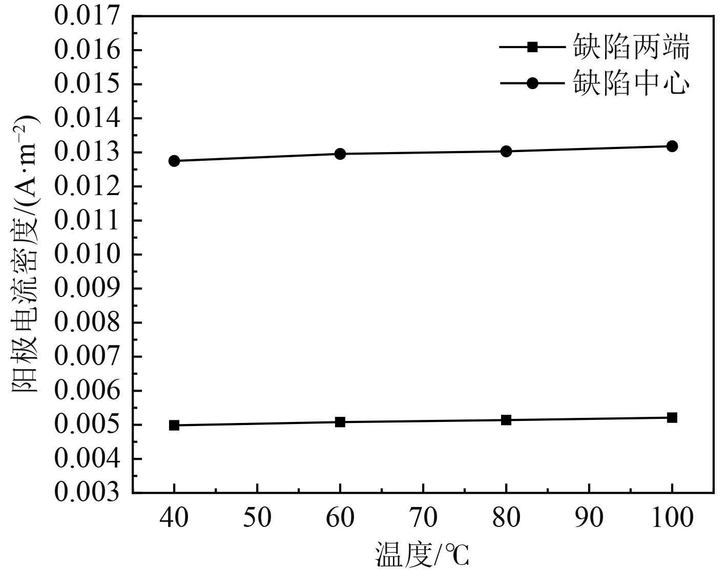 由图20、图21可知,缺陷中心和两端的阳极电流密度随温度升高呈现稳步增长的趋势,缺陷中心变化为