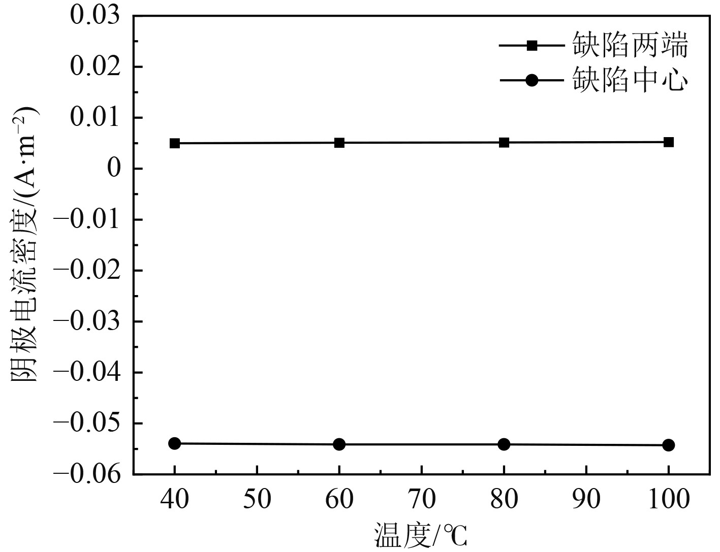 图 21 缺陷中心两端阴极电流密度随温度的变化 Fig. 21 Change of cathode current density at both ends of defect center with temperature |