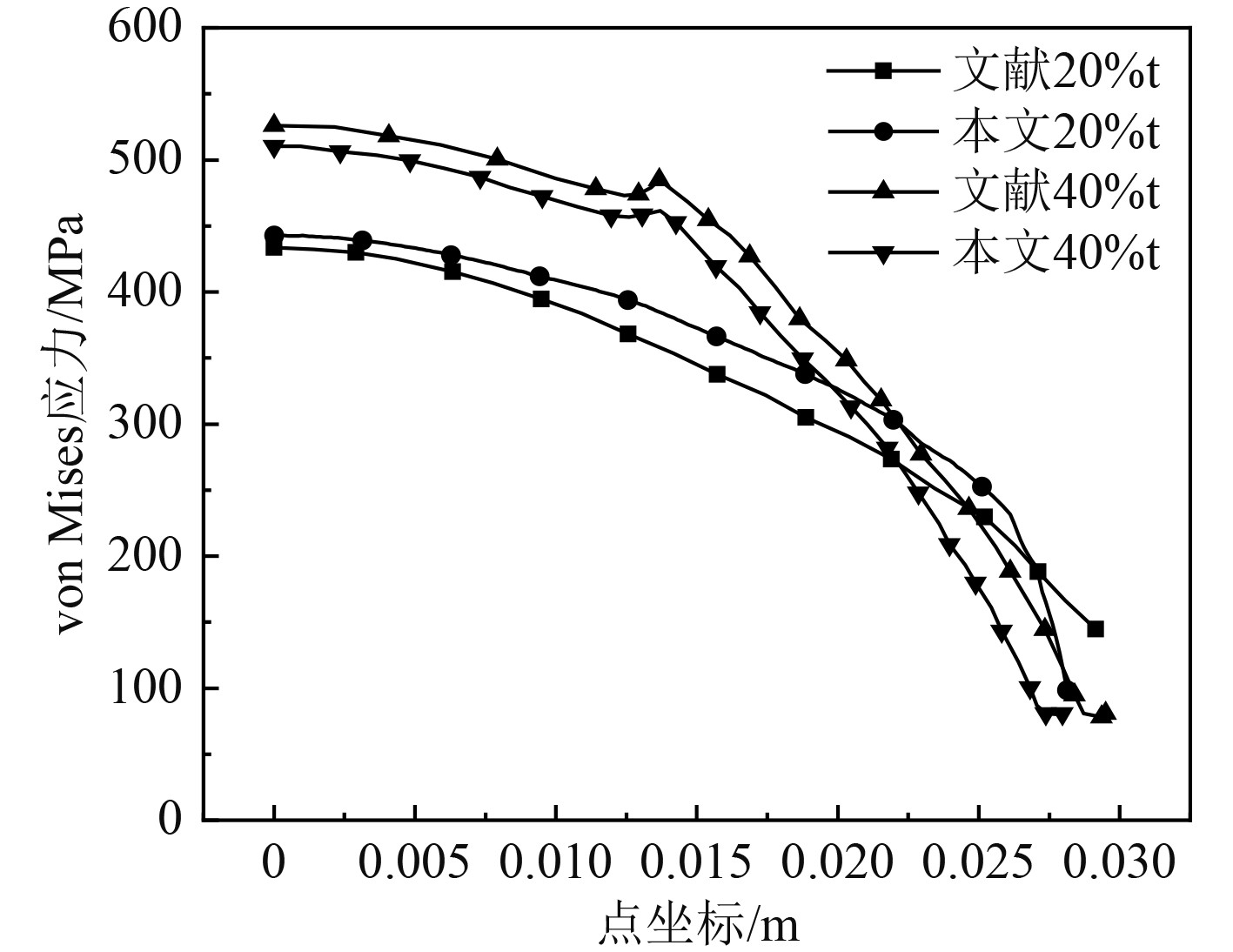 表4为腐蚀缺陷深度是管壁厚度20%和40%时的von Mises应力结果对比。结果表明,由于数值分析方法及网格划分粗细不同,模拟结果存在着一定的误差,但误差较小,误差均小于5%,证明了有限元模型在预测海底管道应力腐蚀方面的有效性和可靠性。
