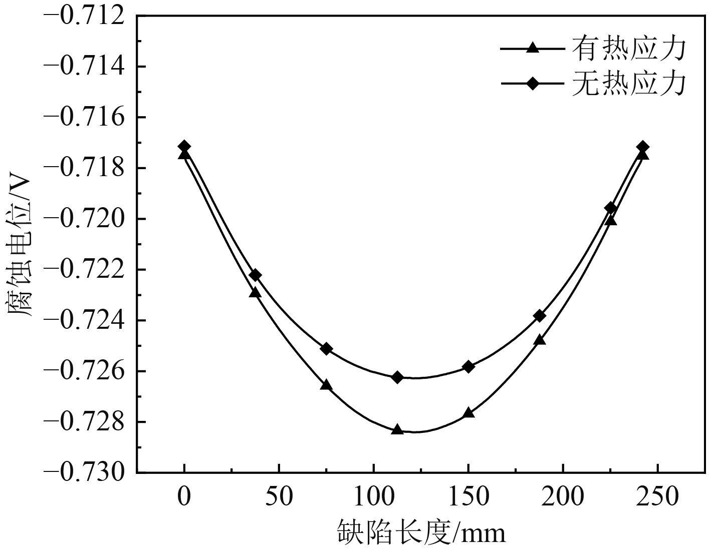 1)有热应力影响情况下,缺陷处的应力更为集中;腐蚀电位越负,管道发生腐蚀的倾向性呈现增大的趋势。