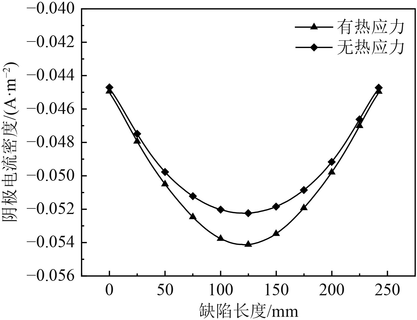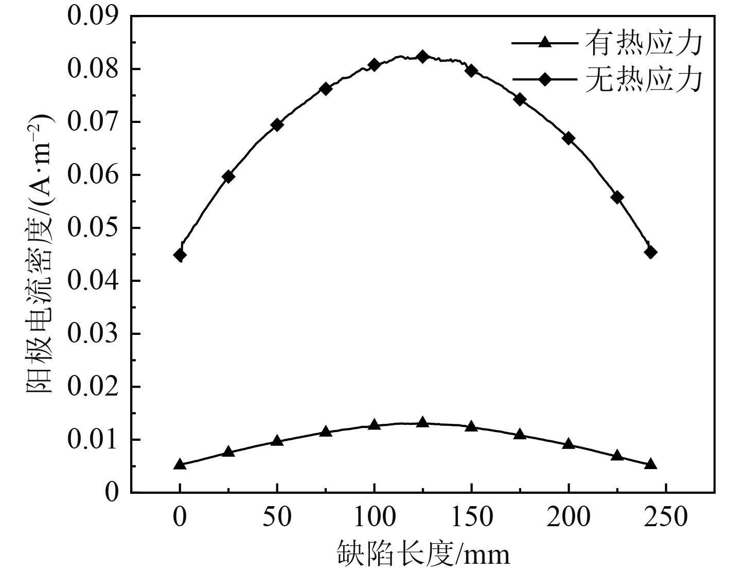 在考虑热应力的情况下,腐蚀电位和阴极电流密度比不考虑热应力时更负,有无热应力时阳极电流密度差距更大,缺陷中心处有热应力比无热应力时大529%。因此,热应力对管道阳极电流密度的影响更加显著。具体如图6~图9所示。