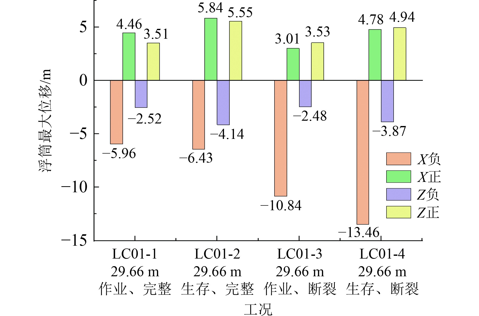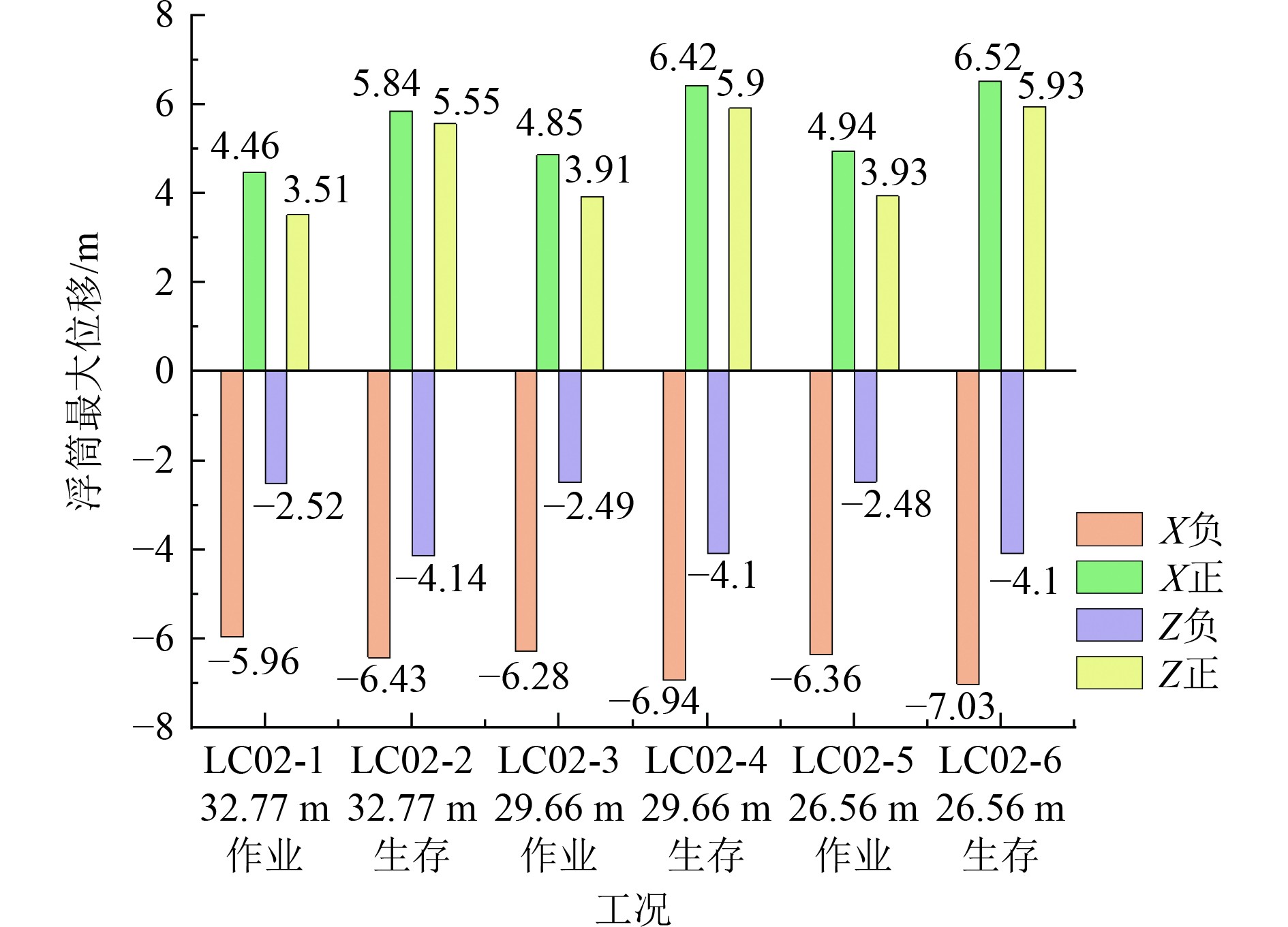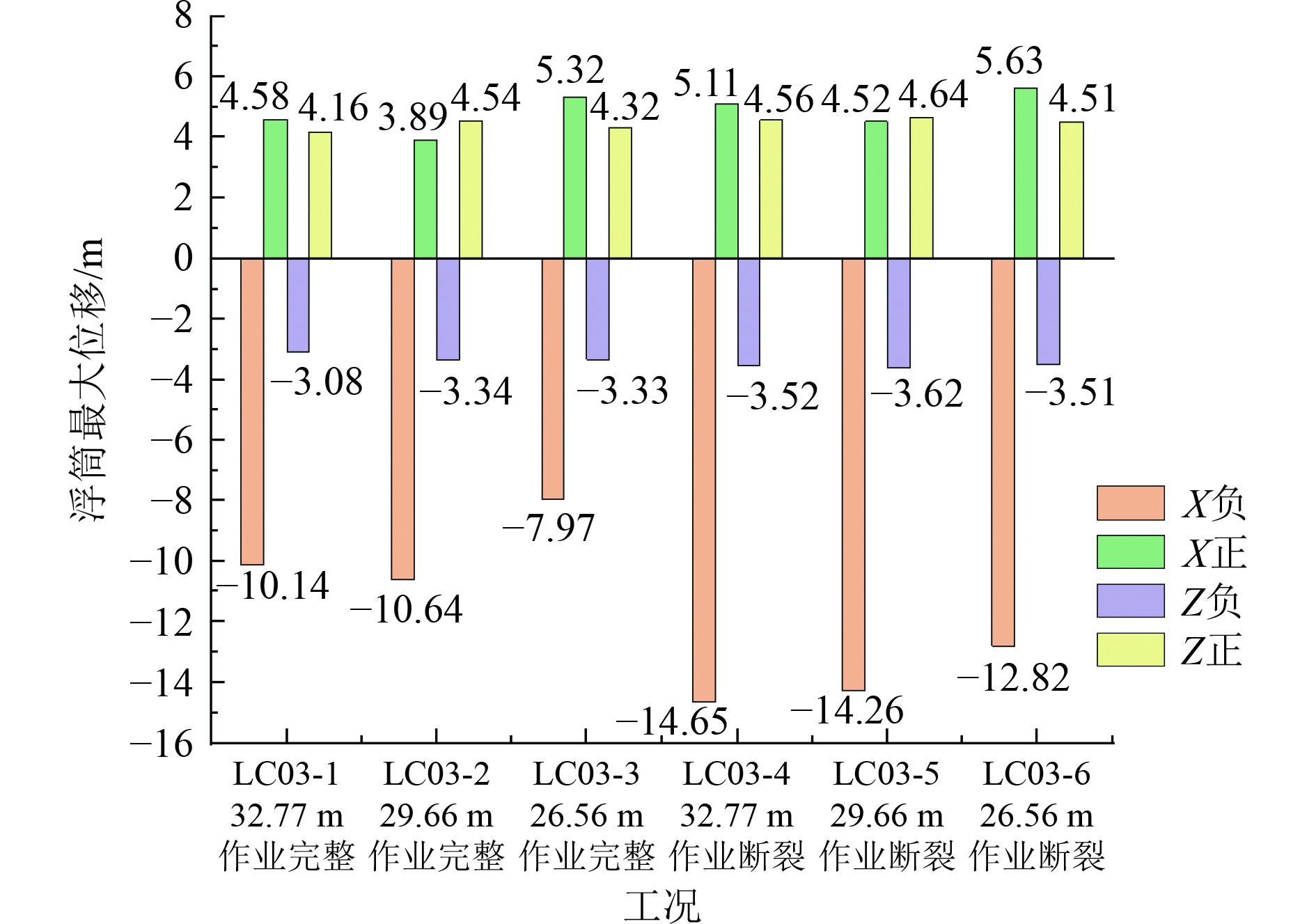 单独考虑水深因素,随着水深变浅,浮筒在X正、X负、Z正3个方向最大位移都增加,即成负相关关系;而水深对浮筒Z负向最大位移影响极小。